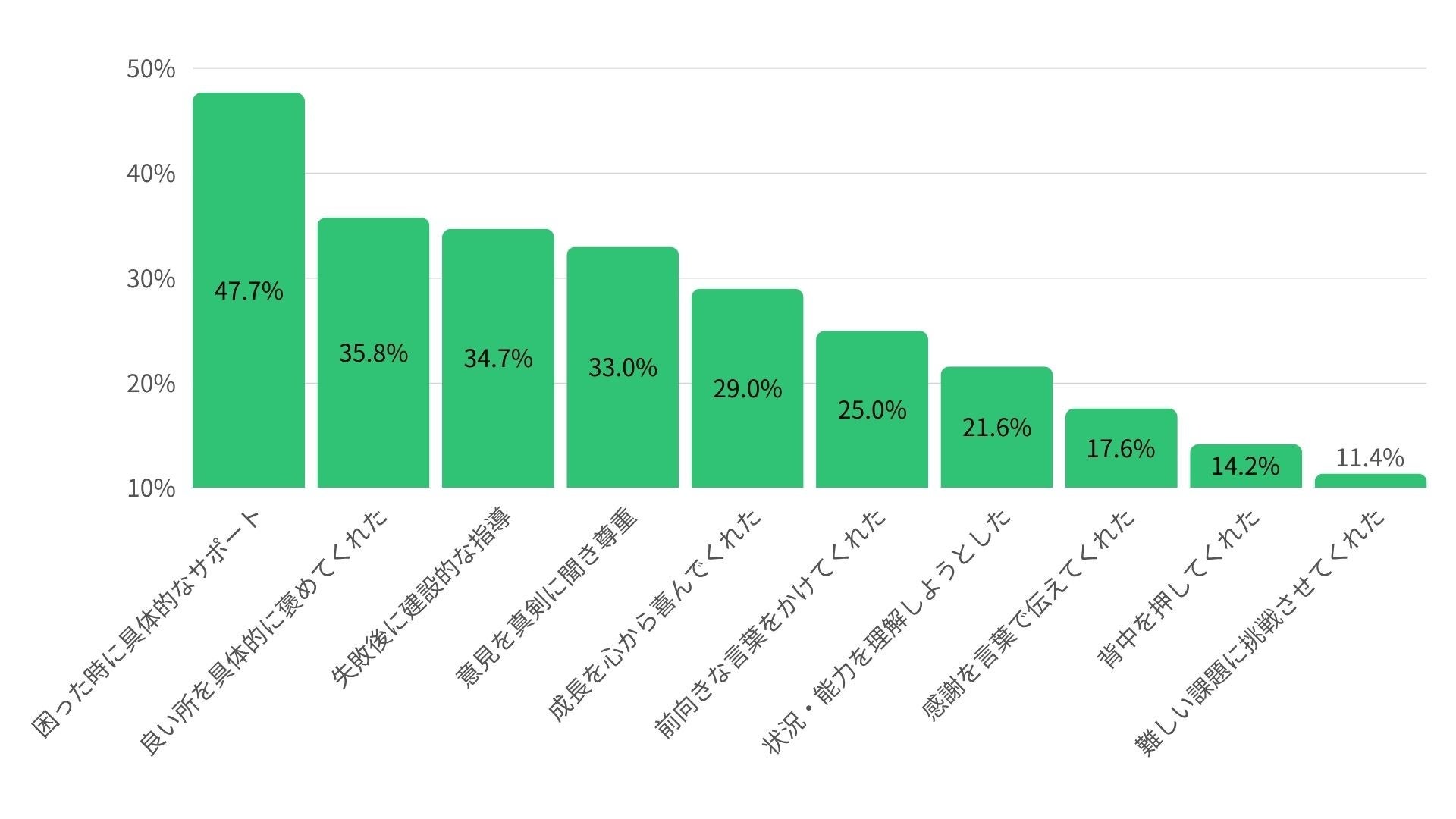 調査の結果、「困った時に具体的なサポートをしてくれた」(47.7%)が約半数の支持を集め1位となりました。次いで「良い所を具体的に褒めてくれた」(35.8%)、「失敗後に建設的な指導をしてくれた」(34.7%)が続き、Z世代が上司に対して、精神論や抽象的な激励よりも、日々の業務における具体的な行動と支援を強く求めていることが明らかになりました。