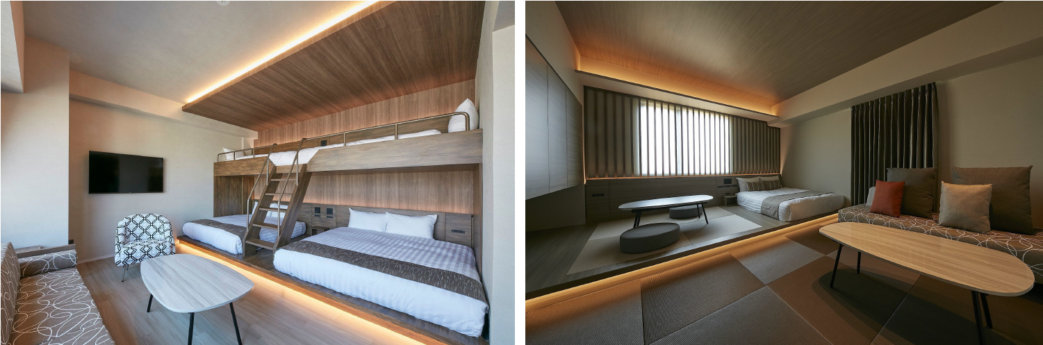 4棟のホテルはそれぞれ、中心地から徒歩数分の好立地に位置し最大6名まで宿泊できる広々とした客室を用意しています。各部屋にはキッチン、洗濯機(伊勢のみ共用ランドリー)、冷蔵庫、テレビ、カードキー不要の暗証番号式の客室ロックを完備し、シモンズ社製のベッドで上質な睡眠環境を提供します。まるで家で過ごすような快適な宿泊環境を実現し、中長期滞在やワーケーションにも適した「暮らすように泊まる」宿泊体験を提供します。