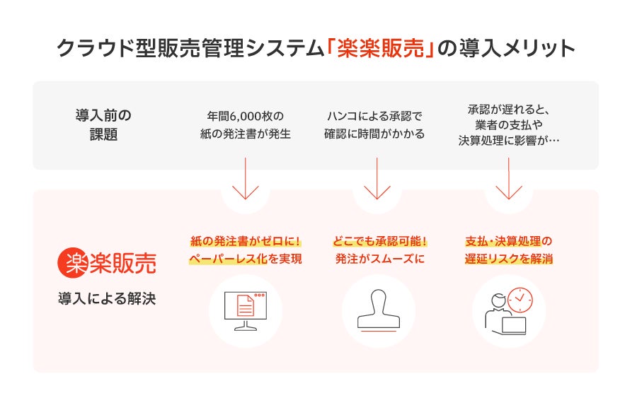 「楽楽販売」で発注書を電子発行でき、紙・ハンコで行う承認作業が不要になることでペーパーレス化を実現できる見込みです。