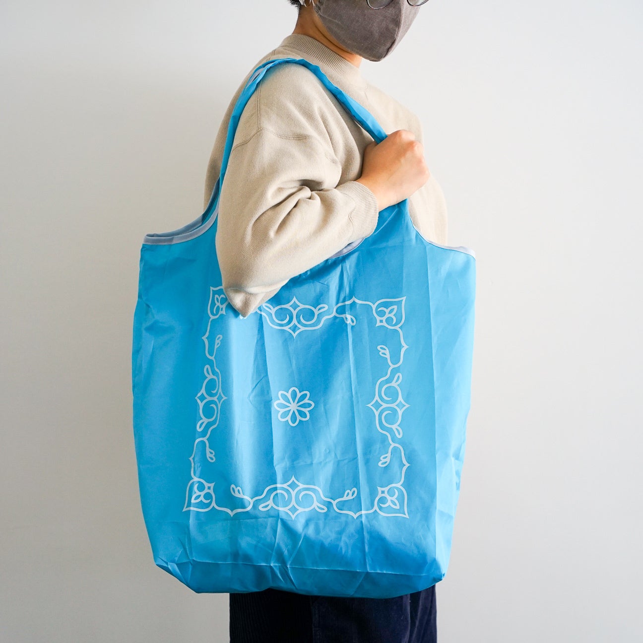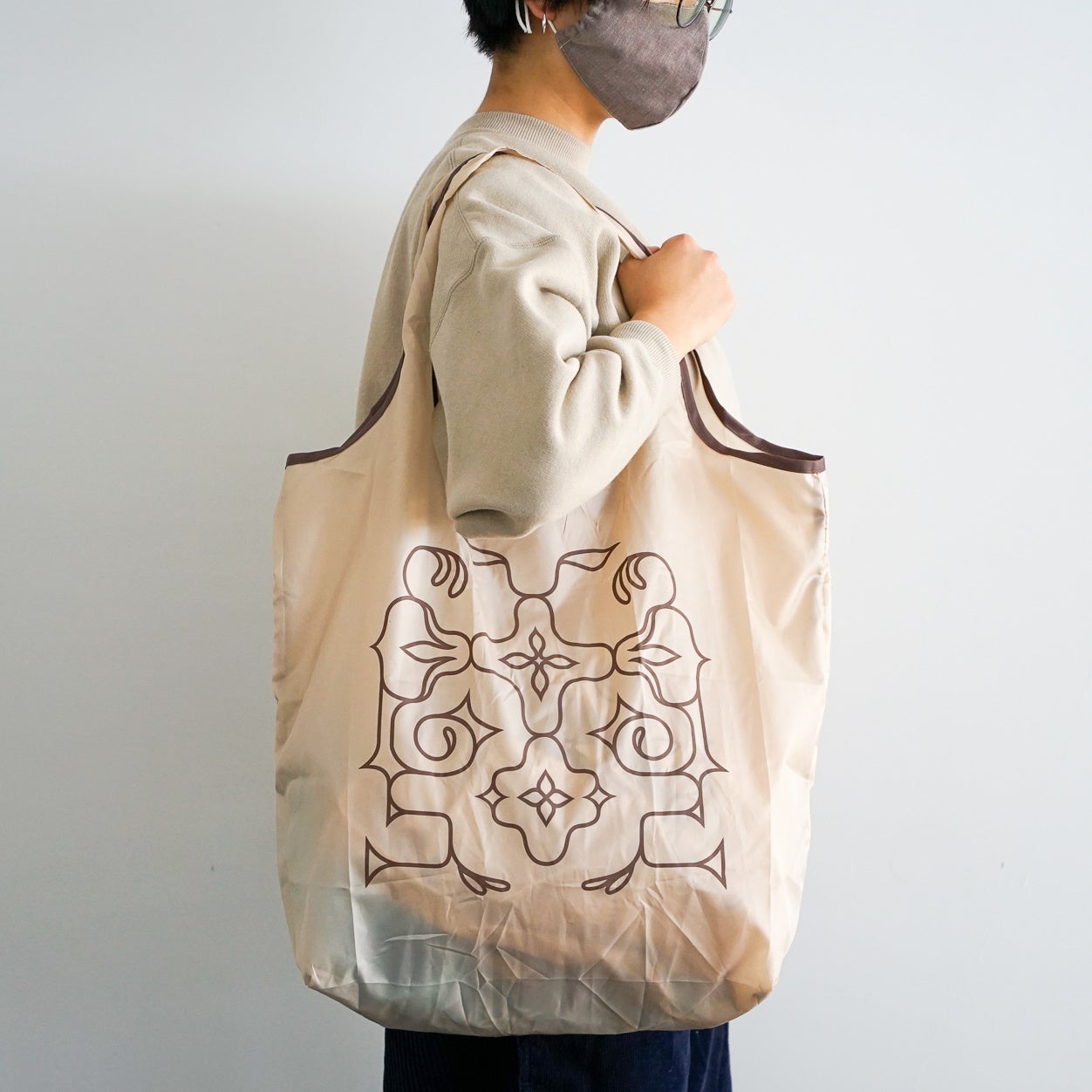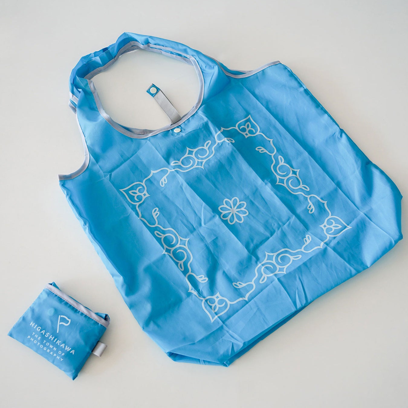 その一環として、この度旭川市にある「川村カ子トアイヌ記念館」の代表を務める川村久恵氏監修のもと、アイヌ文様入りのオリジナルエコバックを商品化。町内事業社でもあるくりや株式会社がプロデュースし、町のオフィシャルパートナーでもあるクロスプラス株式会社が制作しました。2月4日より、東川ミーツせんとぴゅあ店(東川町北町1丁目1番2号)にて販売開始しました。