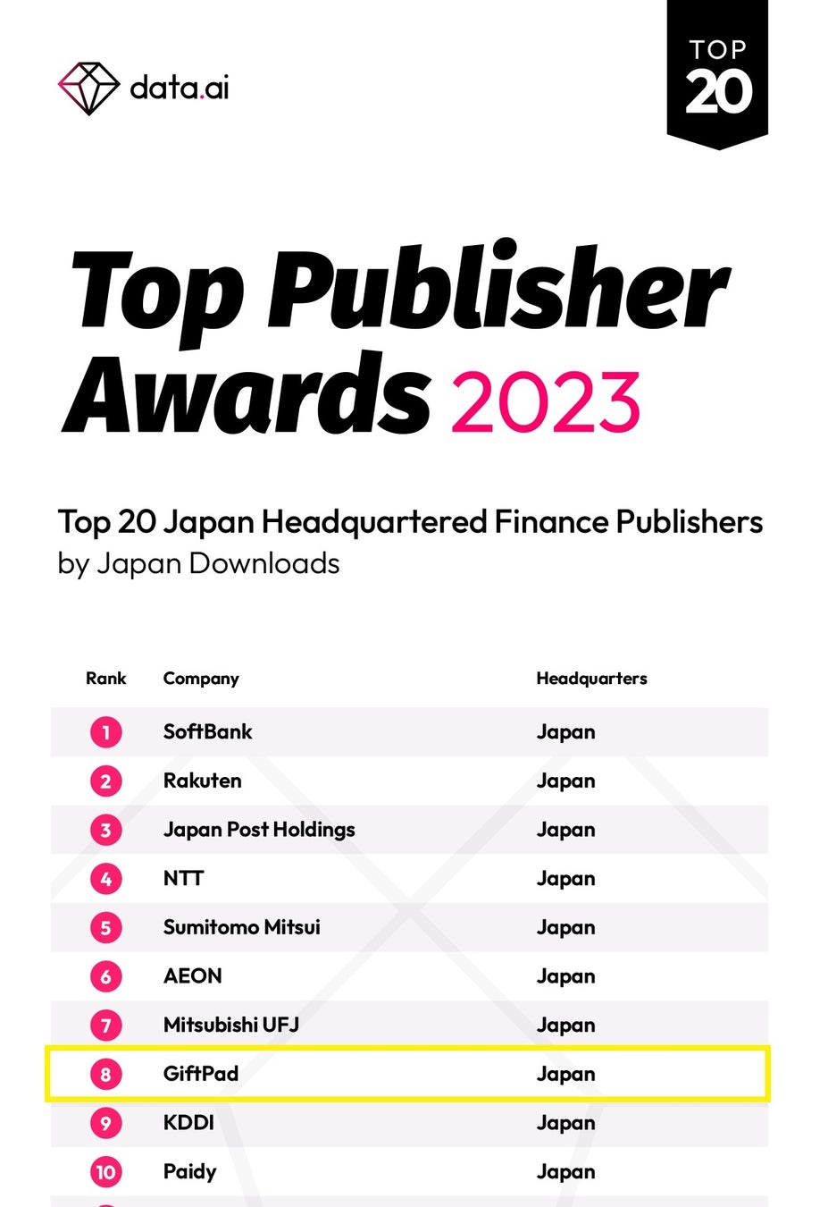 「Top Publisher Award」は、App Annieが提供するモバイル市場データ「App Annie Intelligence」における2022年1月1日〜2022年12月31日の1年間の収益・ダウンロードなどのデータを基に、アプリ市場の成長に大きく貢献をしたアプリパブリッシャー(アプリ提供企業)に対して贈られる賞です。ギフトパッドは本アワードにおいて、国内ファイナンスパブリッシャーで8位を獲得いたしました。