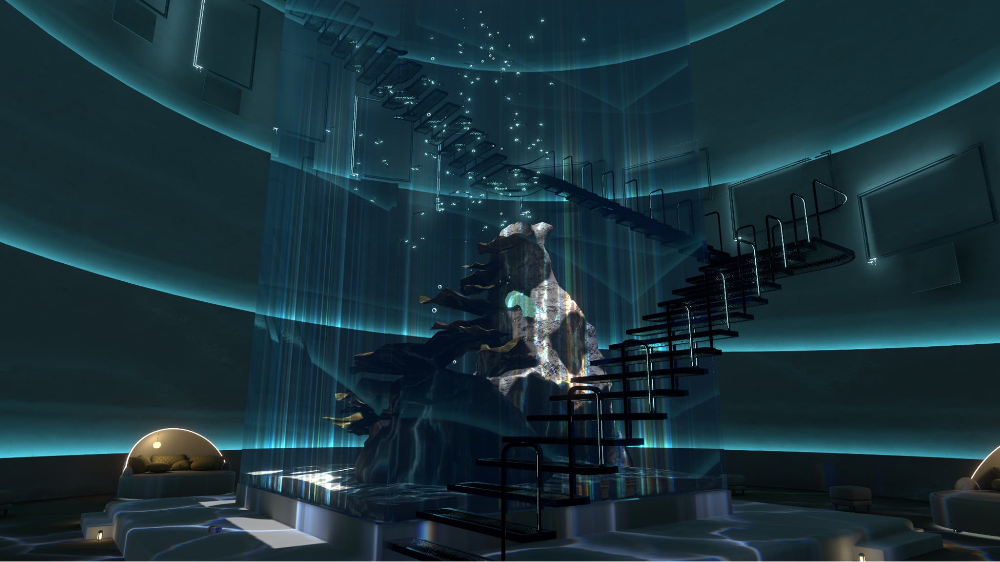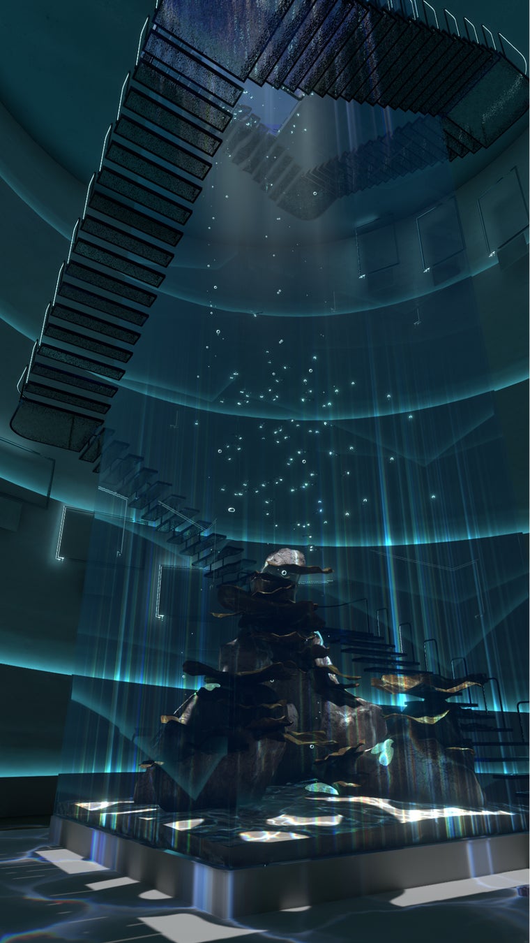 海に浮かぶギャラリーをモチーフに深海を思わせるカラーリングやオブジェクトをあしらい、松坂屋のロゴを屋上に配置し、大丸松坂屋百貨店のクリエイティビティをお伝えできるようなデザインを意識しました。