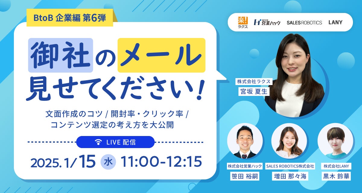 株式会社ラクス(本社:東京都渋谷区、代表取締役:中村 崇則)が提供するメールマーケティングサービス「配配メール」は、2025年1月15日(水)にメール施策にお悩みの法人営業・マーケティングご担当者様に向けて、オンラインセミナー「御社のメール見せてください!! BtoB企業編 第6弾」を配信いたします。