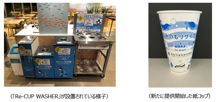 「うみのもリサイクル」は、当社の連結子会社である東罐興業株式会社が開発したカップ洗浄機「Re-CUP WASHER(リカップウォッシャー)」を「仙台うみの杜水族館」のフードコートに設置し、使用済みの飲料カップをお客様自ら洗浄いただき、洗浄後の使用済みカップを分別回収する取り組みです。回収された紙コップは、日本製紙株式会社(東京都千代田区、代表取締役社長:野沢 徹)協力のもと、リサイクルに回します。また、フードコートで使用するコップの素材をプラスチックから紙に変更する際にも、東罐興業株式会社が企画・制作に協力し、新たに提供を開始しました。