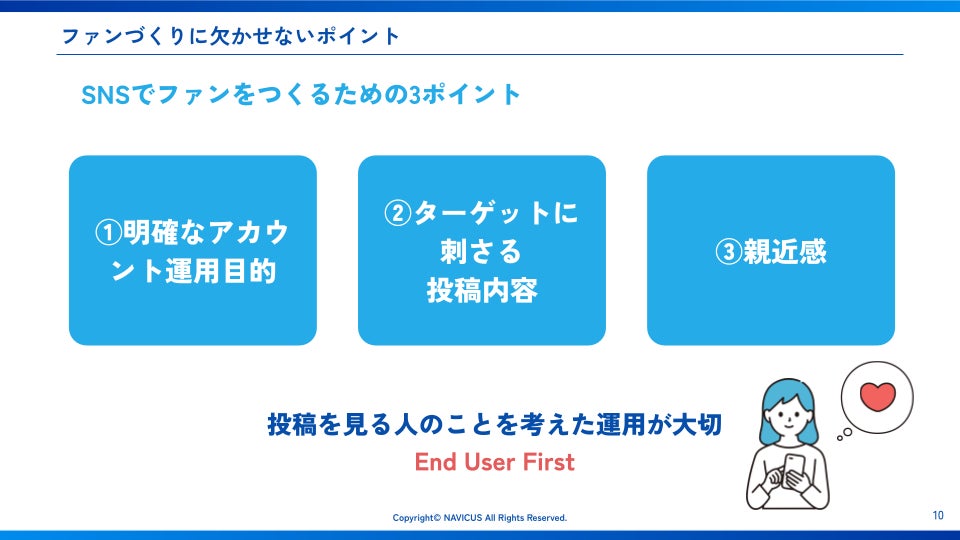 今回のウェビナーでは、SNS上でファンをつくるための3つのポイントについて、自治体様の具体的な運用事例もあわせて解説をしました。