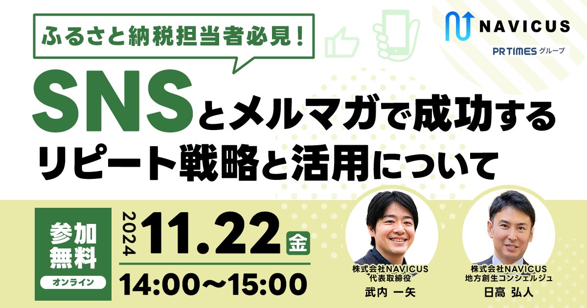 SNSを通じて企業様や地方自治体様のコミュニケーション支援サービスを提供する株式会社NAVICUS(本社:東京都千代田区、代表取締役:武内 一矢、以下:NAVICUS)は、2024年11月22日(金)に、自治体ふるさと納税担当者様、返礼品事業者様を対象に、無料ウェビナー『ふるさと納税担当者必見!SNSとメルマガで成功するリピート戦略と活用について』を実施いたしました。