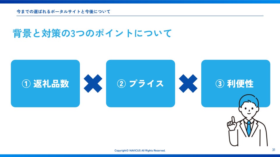ウェビナーの後半では、実際に地方自治体のご担当者様とふるさと納税ポータルサイト運営・改善をおこなってきた経験をもつ社員から、今後選ばれるポータルサイトになるための3つのポイントを解説いたしました。