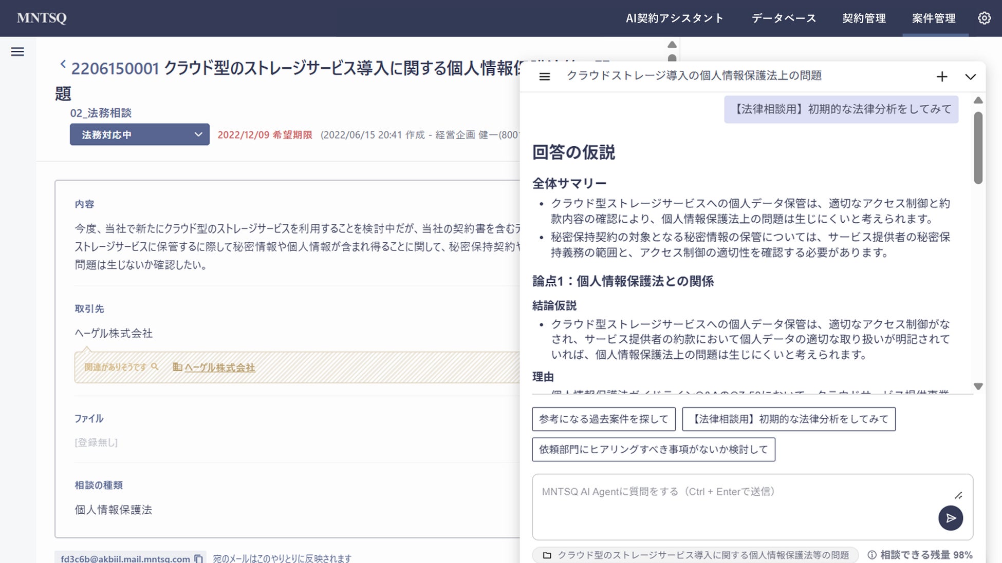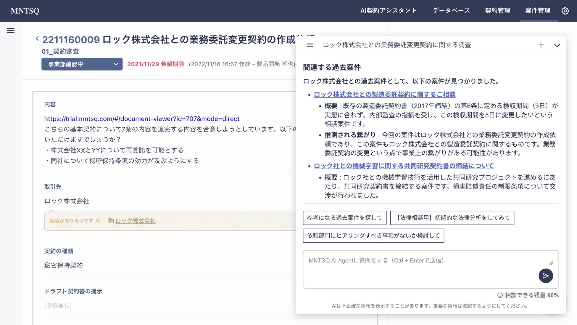 「MNTSQ CLM」の案件管理に「MNTSQ AI Agent」を実装