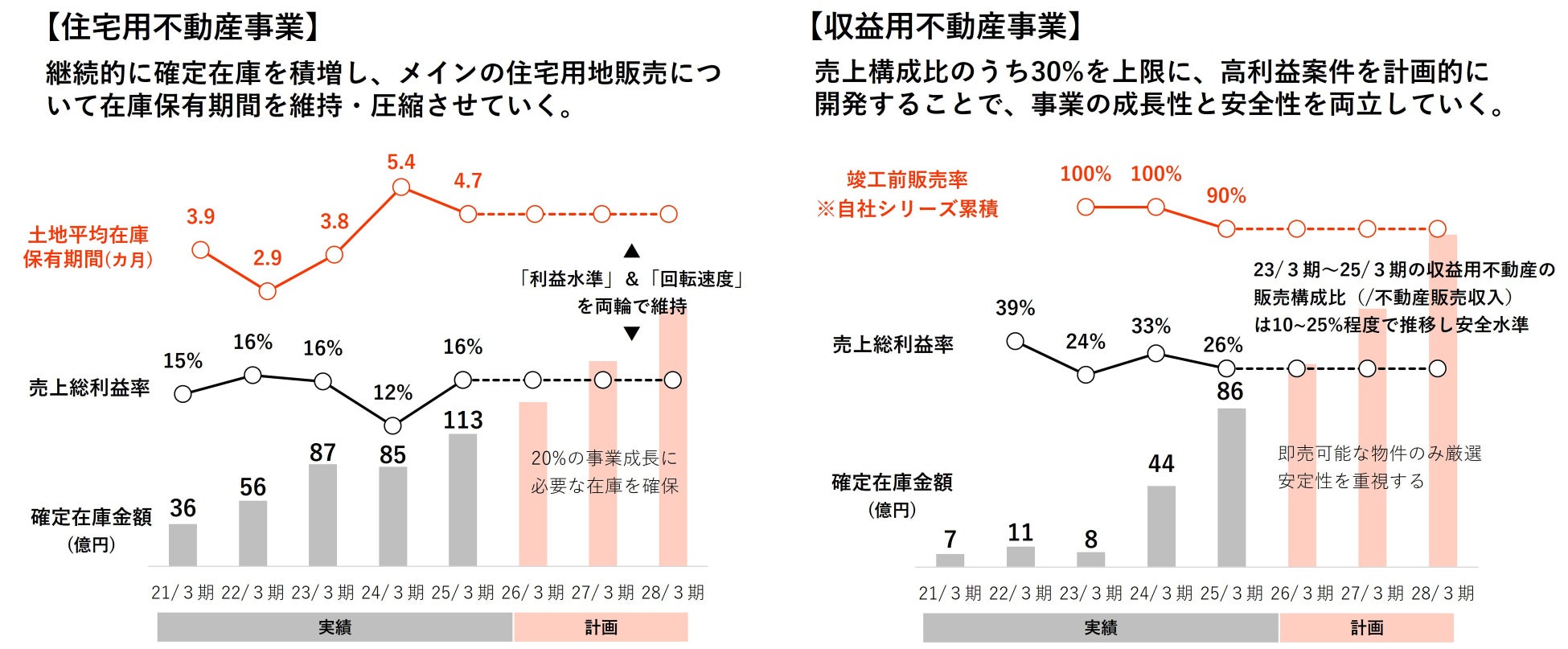 ともに、総利益率水準をKPIとし、住宅用不動産事業においては在庫保有期間、収益用不動産事業においては竣工前販売率をKPIとしました。
