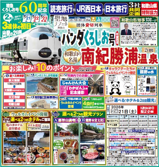 株式会社読売旅行(本社:東京都中央区、代表取締役社長:岩上秀憲)と株式会社日本旅行(本社:東京都中央区、代表取締役社長:吉田圭吾)は、昨年度共同企画実施した商品を今年度2026年2月も、新大阪駅~紀伊勝浦駅間でパンダ柄を装飾した「特急パンダくろしお号」の団体貸切列車を運行させ、南紀勝浦温泉に宿泊する2社連携ツアーを実施します。今年度の連携ツアーは、10月に実施した「加賀温泉まつり」に続く第2弾で、11月上旬より販売を開始します。