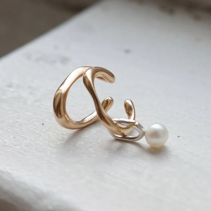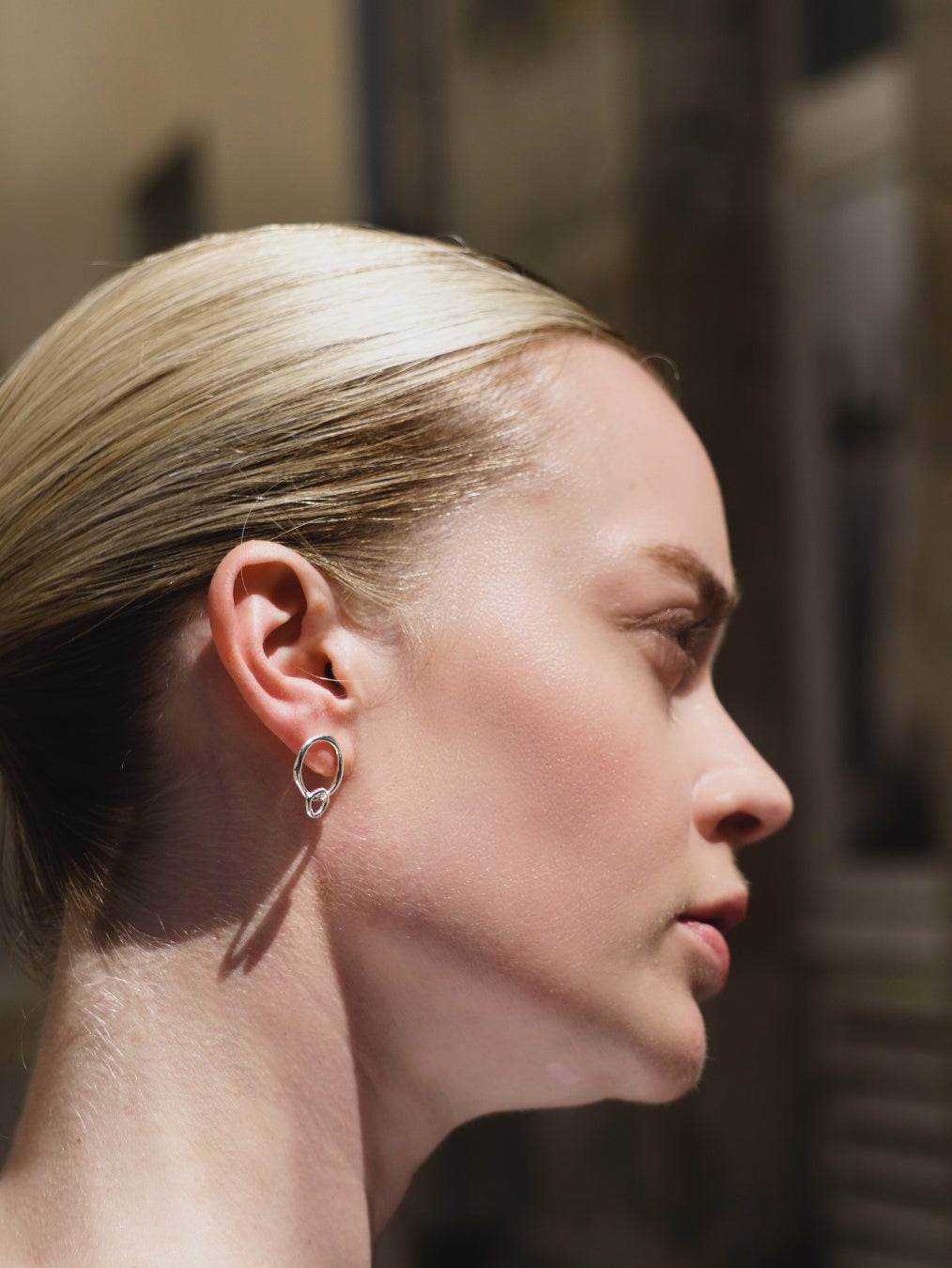 シルバーのモチーフにゴールドを閉じ込めた独特のフォルムと、職人の繊細な技術が光るアイテムです。一つでももちろん、両耳に着用いただくことで華やかさがさらに際立ちます。
