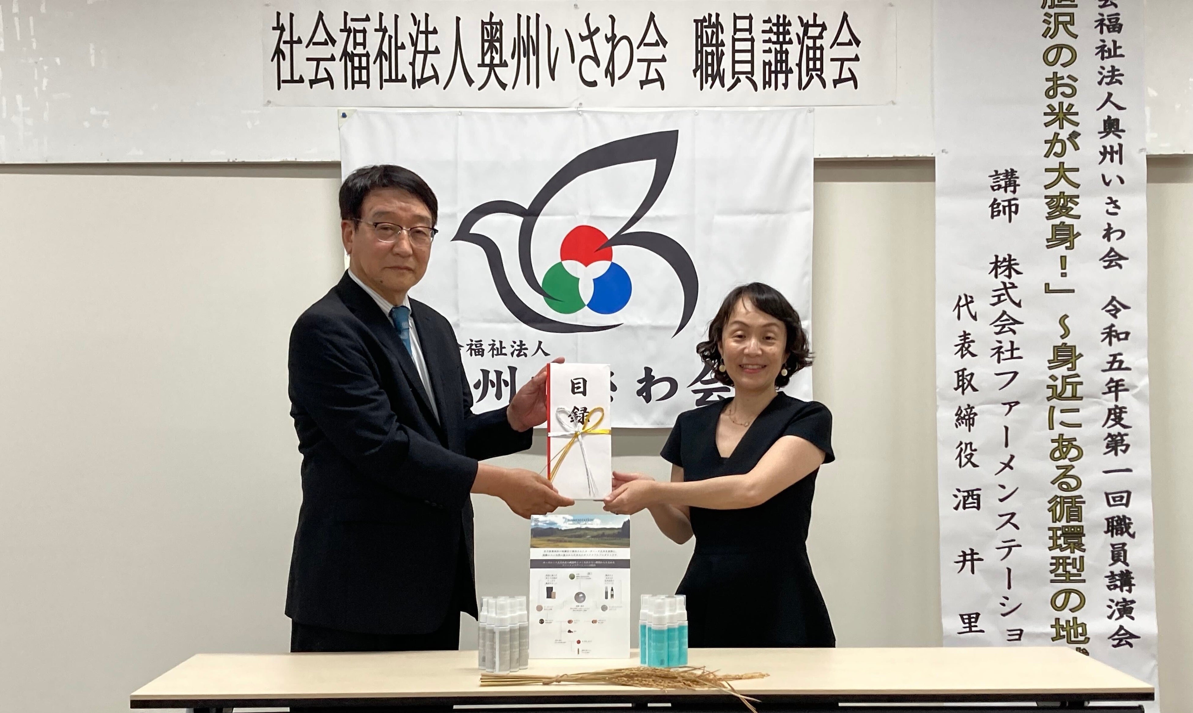 ファーメンステーションが岩手県奥州市に拠点を置く社会福祉法人「奥州いさわ会」と商品製作等で連携:連携開始にあたり、施設や全職員の衛生管理・活動支援を目的に、当社製品「お米でできたハンドスプレー」を寄付