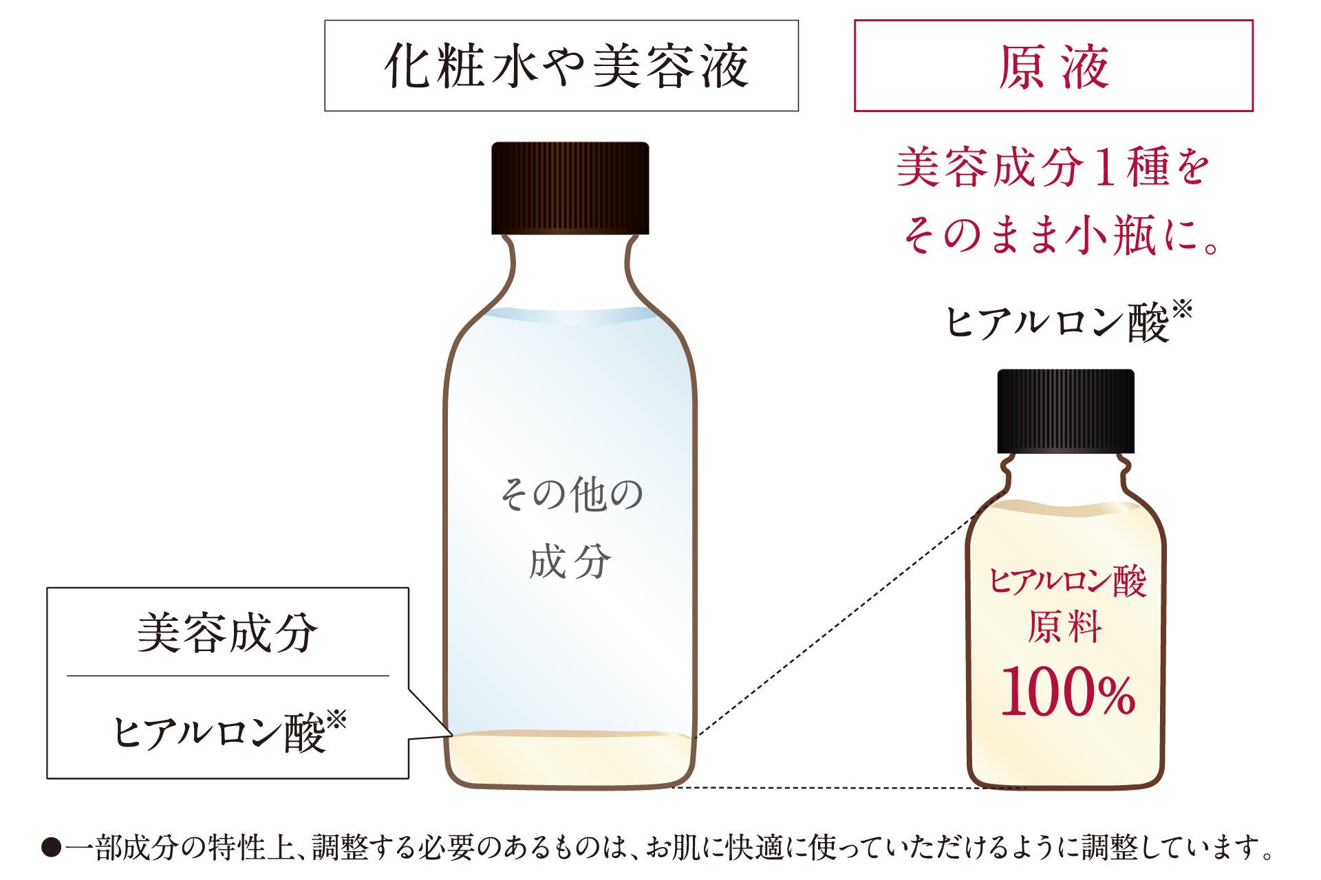 ひとつの美容成分の原料をそのまま小瓶に詰めたもの。つまり、化粧品原料100%の高濃度美容液です。現代の肌悩み*に合わせて、数多くの原料の中から原液を厳選*3しています。