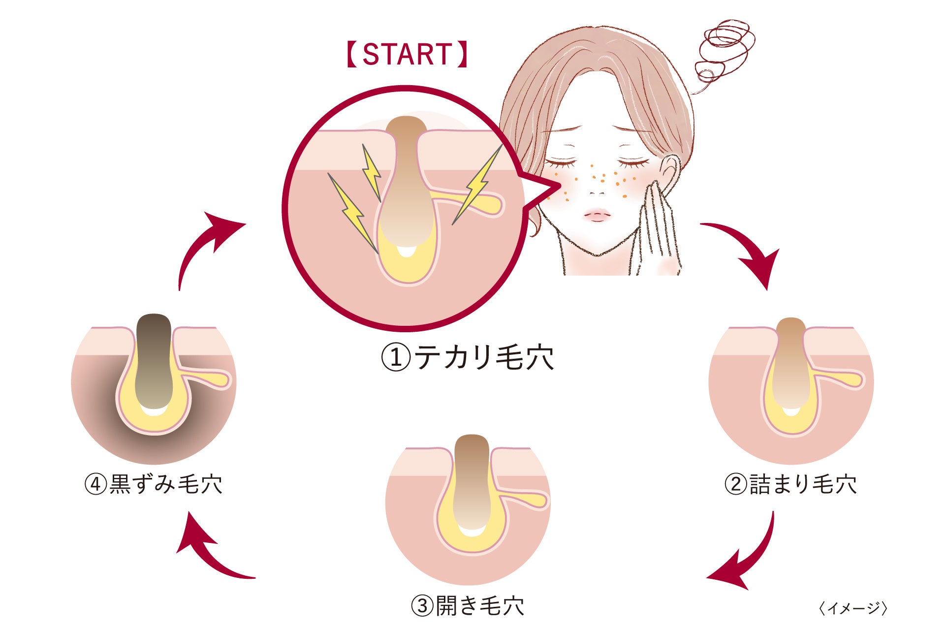頑固な毛穴悩みの要因の一つとして、乾燥による皮脂過剰が挙げられます。肌が乾燥すると、それを補おうと皮脂の分泌が活性化。乾燥により皮脂の過剰分泌が続くことで、毛穴に詰まった角栓が肥大化し、毛穴が拡大。さらに、さまざまな毛穴悩みの原因につながります。