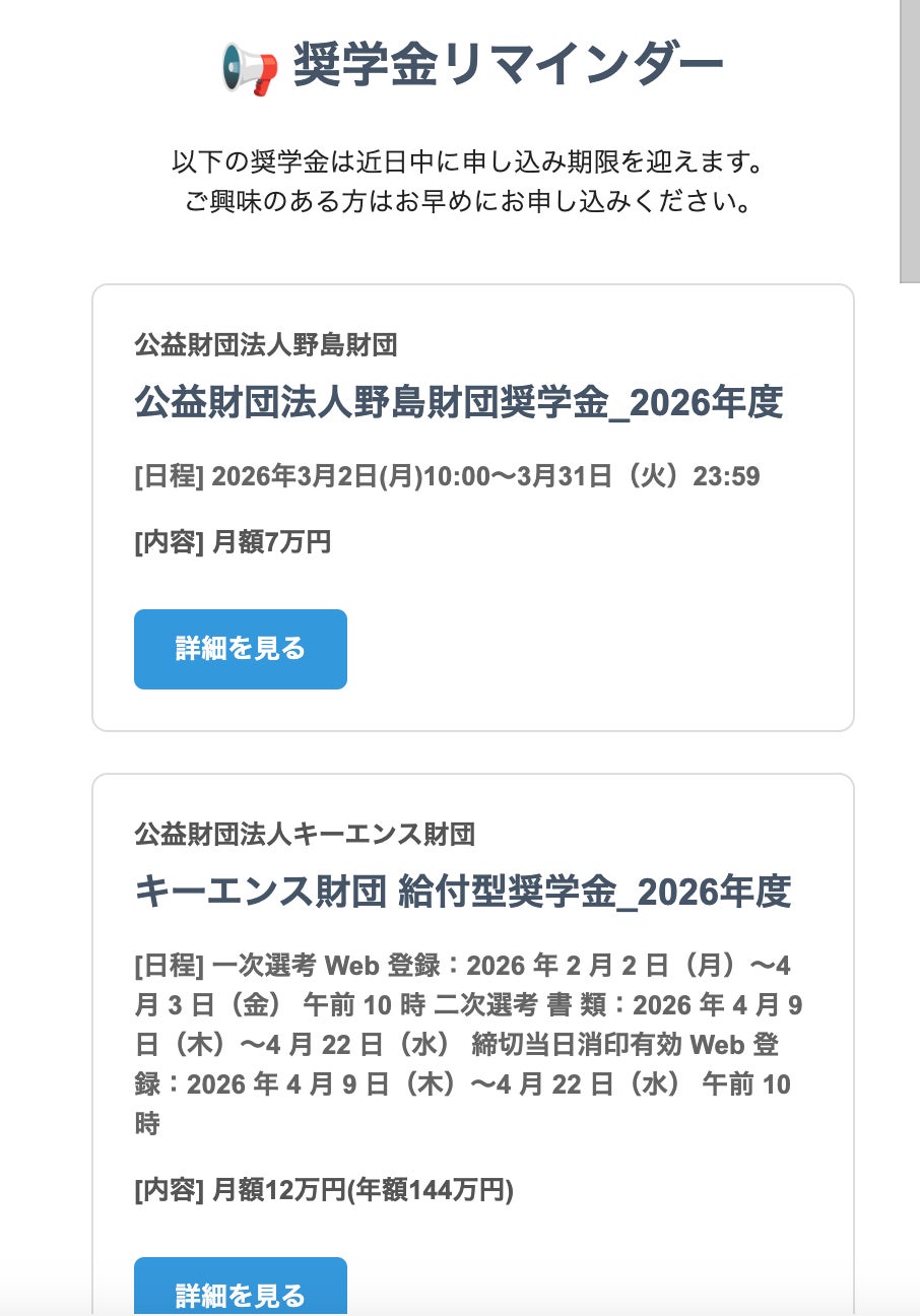 ガクシーに登録すると、主要奨学金の募集情報を毎月メールで受け取ることができます。奨学金の締切を見逃すことなく、条件の良い制度へ申し込むことができます。