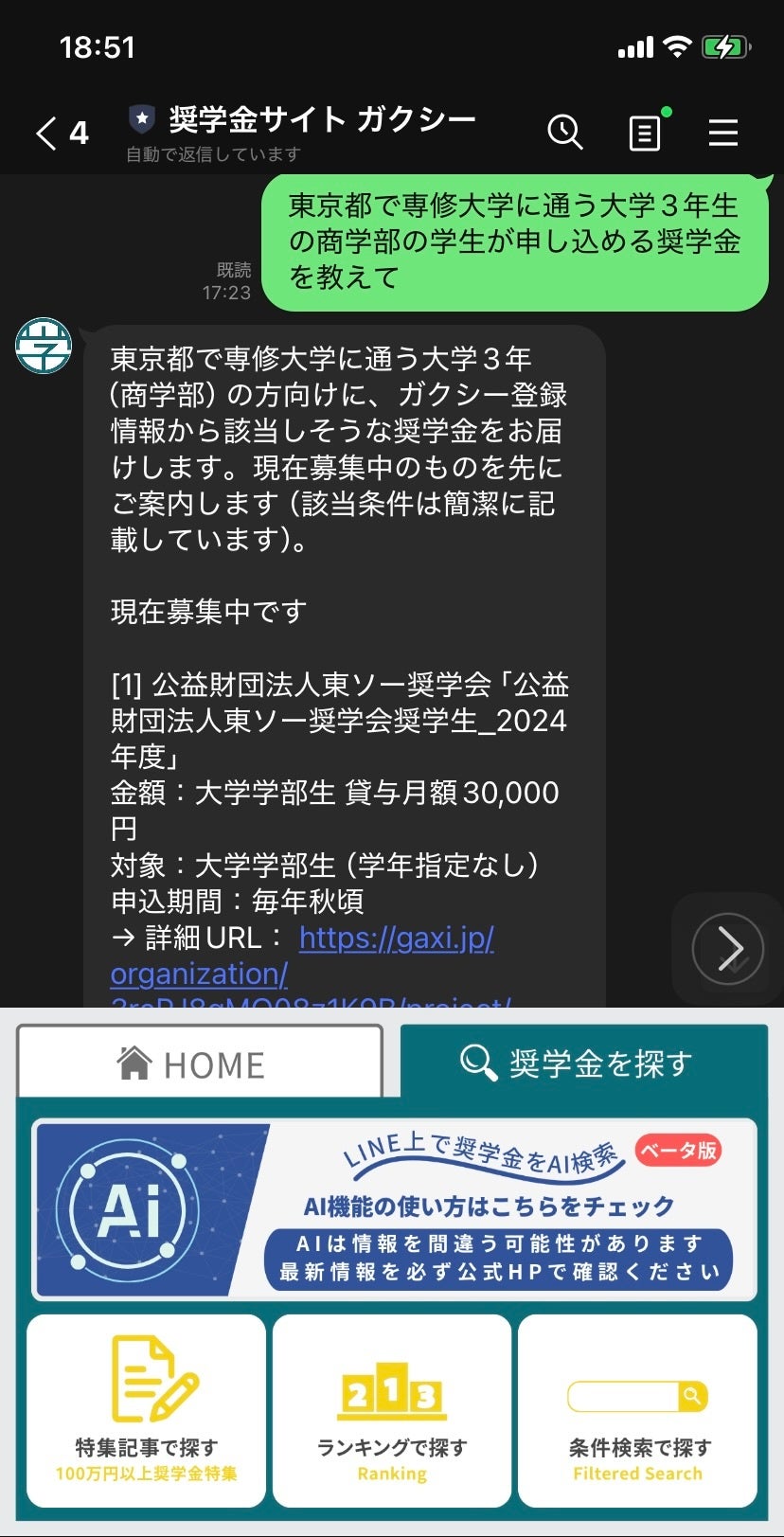LINEで質問するだけでAIが奨学金候補を提案