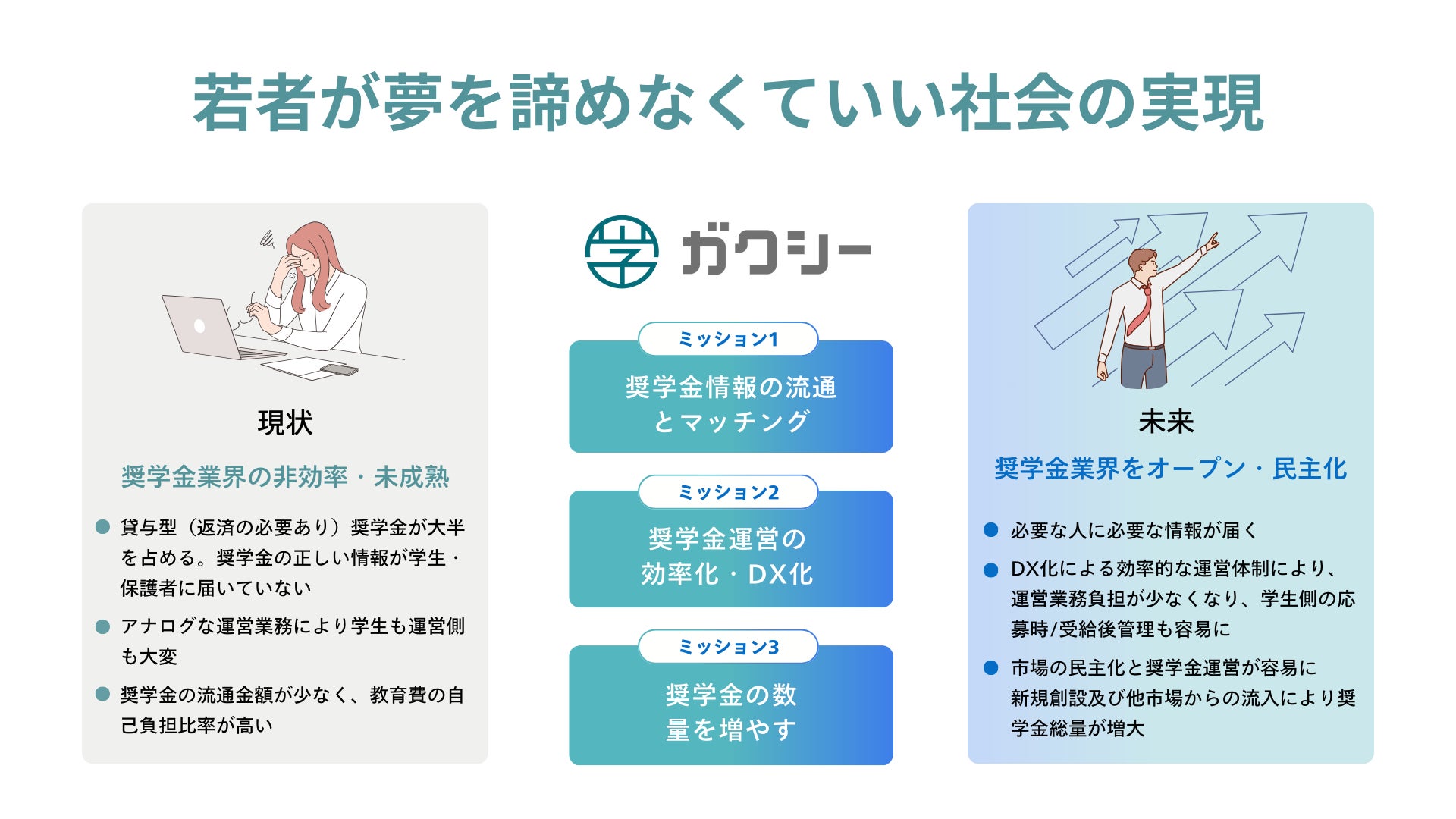 株式会社ガクシーは、『諦めなくていい社会の実現』を目指して若者の可能性を広げる新しいお金の流れを創造する事業を行っています。経済的な理由で夢を諦めることのない、さらには、挑戦者が世の中を変革し、牽引していけるような社会の実現を目指しています。具体的には、奨学金の利用者である学生や保護者向けに日本最大級の奨学金情報サイト「ガクシー」を運営し、学校・地方自治体・財団などの奨学金運営団体向けにはクラウド型奨学金運営管理システム「ガクシーAgent」およびBPO(業務支援)を提供しています。また、資金を提供したい個人や団体向けに簡単に少額から奨学金を創設できるサービス「シン・奨学金」や「奨学金コンサルティング」、企業向けに奨学金を活用した「学生採用・集客支援サービス」も提供しています。これらの事業を通じて、教育格差の是正・貧困の撲滅といった社会課題を解決してまいります。