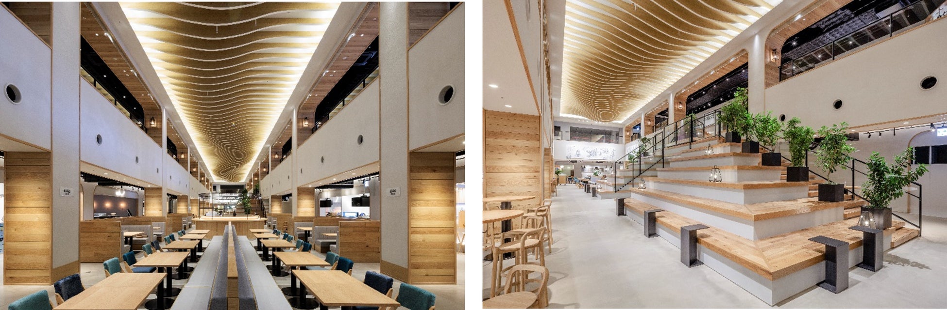 瀬戸内海の凪を表現した奥行き約70mの波形の天井や、岡山デニムを使用したチェアなど瀬戸内の自然や特産品から着想を得た、洗練されたデザインが特長の空間。