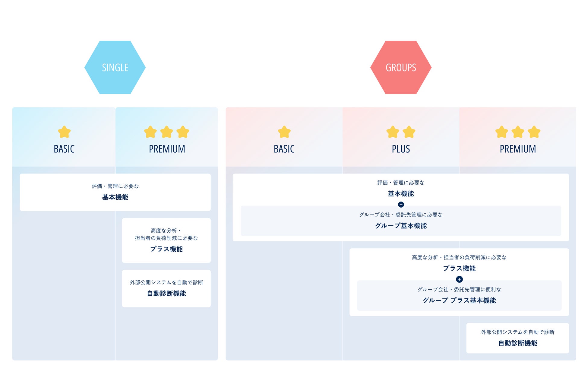 グループ統制や委託先管理など、多様なセキュリティ評価の場面で活用していただけるよう、従来の「GROUPS BASICプラン」を機能拡張しました。「SINGLE BASICプラン」と同一の機能に加えて、NRIセキュアが独自に策定した設問を用いて、グループ各社のセキュリティ評価ができる機能を備えています。