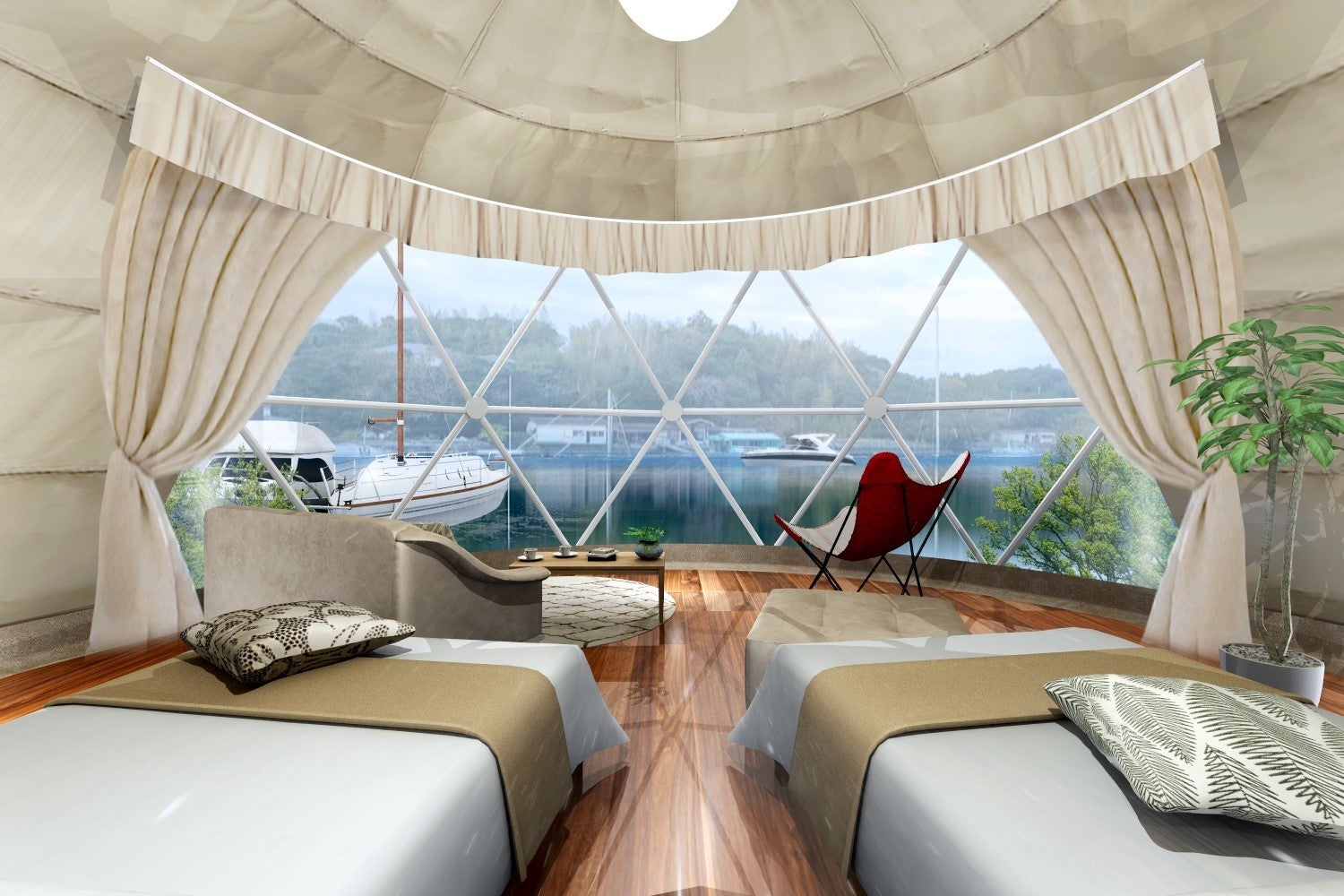 ドーム型テントの開放的な窓部分や個別に設置されたバスルームからは、刻々とうつろう空と海の色や夜の水面を照らす月明かり、満天の星空を眺める非日常の景色をお楽しみ頂けます。