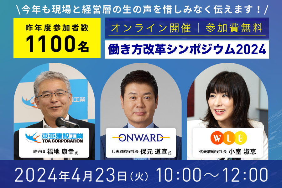 本シンポジウムには、コロナ禍を経て業績と株価をV字回復させた株式会社オンワードホールディングス代表取締役社長・保元道宣氏、今春(2024年4月)から働き方改革関連法が適用された建設業で上限規制に真摯に向き合う東亜建設工業株式会社建築本部執行役員/設計設備統括部長/働き方改革推進責任者・福地康幸氏、同社土木本部理事技術担当/働き方改革推進責任者・後藤良平氏が登壇するほか、当社代表取締役社長・小室淑恵からは2024年の労働基準法改正、2025年の育児介護休業法の改正、政府で議論が進んできている勤務間インターバル制度や女性活躍推進、アンコンシャス・バイアスを学ぶゲーム型研修といった最先端の働き方改革に関する情報をお話しします。参加費は無料で、事前お申込みによりアーカイブ配信も実施します。