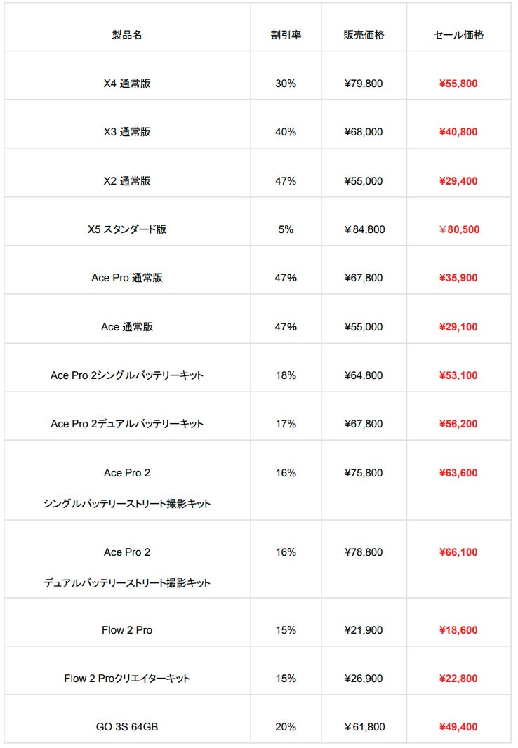 セール期間中は、大人気の360度アクションカメラがInsta360 X4(以下X4)が30%、Insta360 X3(以下X3)が40%、Insta360 Ace Pro(以下Ace Pro)が47%、Insta360 Flow 2 Pro (以下Flow 2 Pro)が15%割引と、大変買い求めやすい価格となっています。