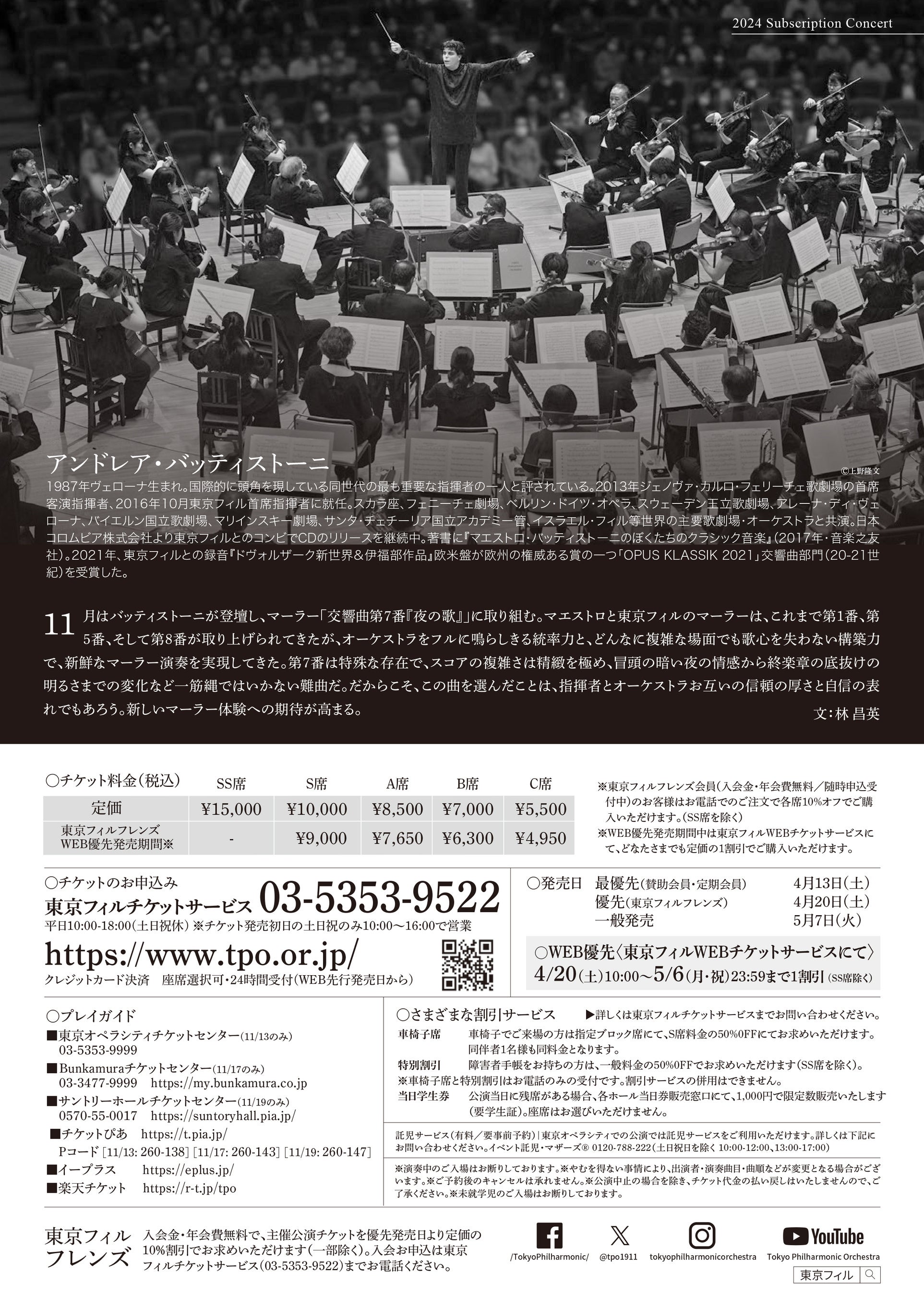 ※東京フィルフレンズ会員様は10%割引で購⼊いただけます(SS席を除く/受付はお電話のみ)。