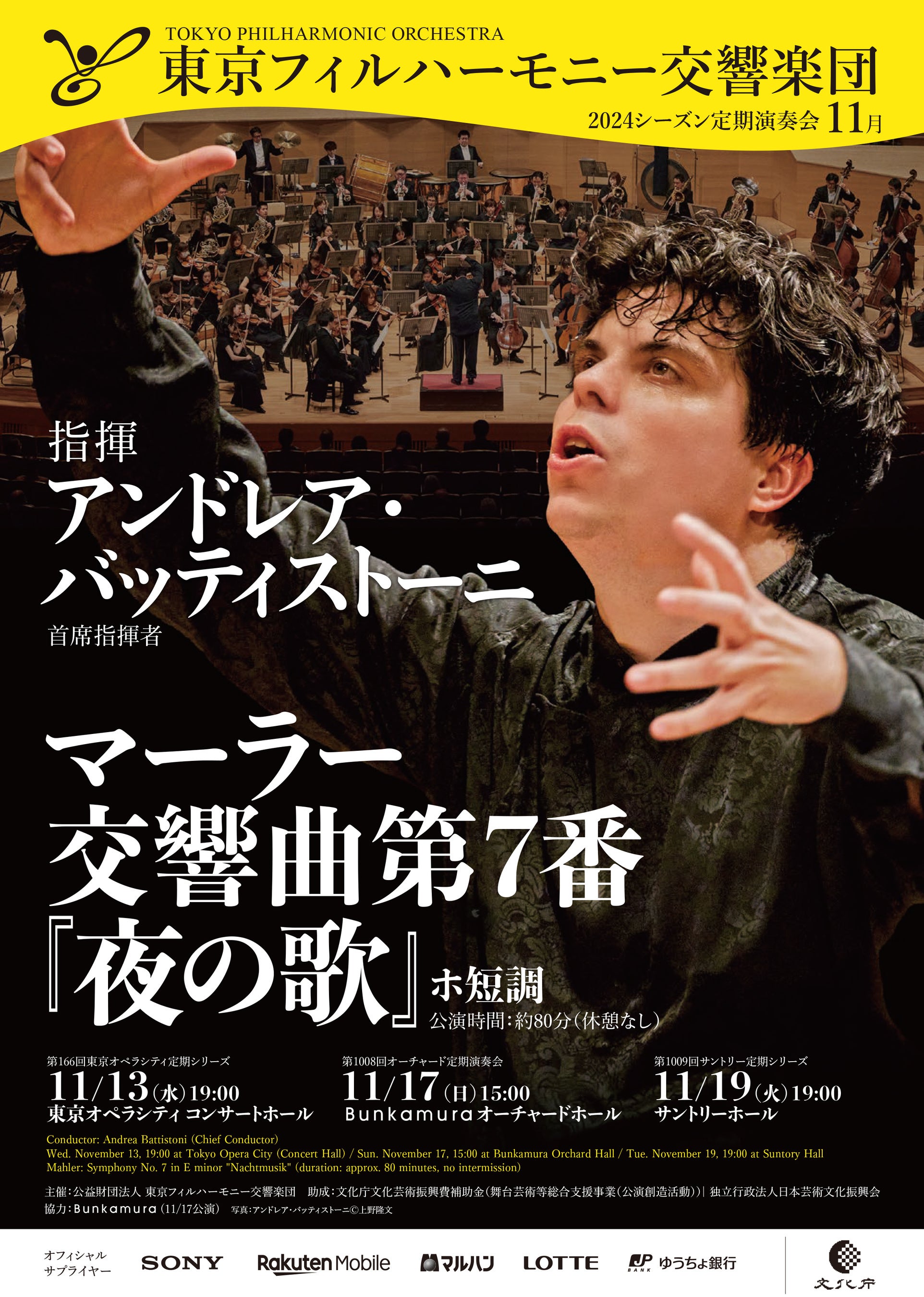 公益財団法人 東京フィルハーモニー交響楽団(以下、東京フィル/所在地:東京都新宿区/理事長:三木谷浩史)の2024シーズンのファイナル、11月定期演奏会(11/13,17,19)を首席指揮者アンドレア・バッティストーニのもと3公演で開催いたします。演目は待ち望まれたマーラー「交響曲第7番『夜の歌』」。シーズンの締めくくりに相応しく、大規模な管弦楽を歌心とともに統率するバッティストーニの手腕そして東京フィルとの関係の深まりをお楽しみいただきます。