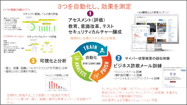 実際の製品デモを通して、その機能が説明されました。まずは、トレーニングコンテンツの豊富さです。Netflixのようなコンテンツライブラリーに収納されて、適切なコンテンツを簡単に選択できます。記憶に残る、受講者を引く付けるストーリー仕立てのコンテンツが紹介されました。次に、すべてを集中管理することを可能にするKnowBe4管理コンソールも実演で、次の主な特徴が説明されました。受講コースをトレーニングキャンペーンの迅速な設定(ユーザーグループ(スマートグループ)毎にトレーニングモジュール選択・実施期間決定)から新規ユーザーの自動登録、トレーニング未完了者への喚起メール自動化までを一括管理。各部門やグループの成果をスコア化。Phishing Prone Percentage(PPP:フィッシング詐欺ヒット率)とセキュリティ意識レベル実力評価(SAPA)スコアのほか、同業界の総スコアを対比表示、など。
