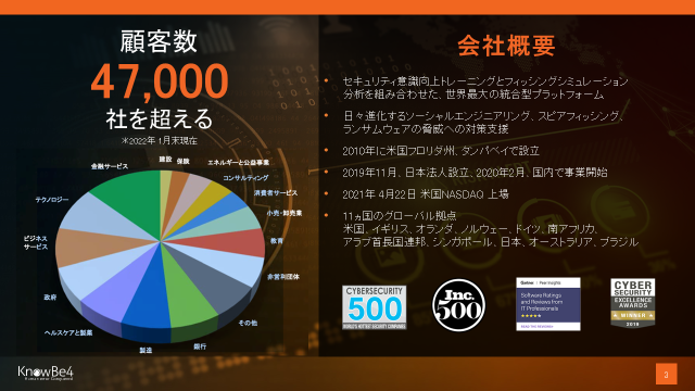 KnowBe4(NASDAQ: KNBE)は、セキュリティ意識向上トレーニングとフィッシングシミュレーション・分析を組み合わせた世界最大の統合型プラットフォームのプロバイダーです。KnowBe4は、IT/データセキュリティ・エキスパートであるStu Sjouwerman(ストゥ・シャワーマン)によって2010 年8 ⽉に米国フロリダ州タンパベイで設立され、セキュリティの「人的要素:ヒューマンエラーの克服」にフォーカスして、ランサムウェア、CEO攻撃/詐欺、ビジネスメール詐欺(BEC)を始めとする巧妙化するソーシャルエンジニアリング手口などの社員ひとり一人のセキュリティに対する認識を高めることで、「人」を狙うセキュリティ脅威から個人、組織、団体を防御することを支援しています。世界で最も著名なサイバーセキュリティ・スペシャリストであるKevin Mitnick(ケビン・ミトニック)がCHO(Chief Hacking Officer)を務めています。同氏のハッカーの視点に立った知見をベースにKnowBe4のトレーニングプログラムは組み立てられています。2022年2月現在、 4万7千社を超える企業や団体がKnowBe4を採用して、防御の最終ラインとして「人」による防御壁を構築しています。KnowBe4についてさらに知りたい方は、www.knowbe4.jp をアクセスしてください。