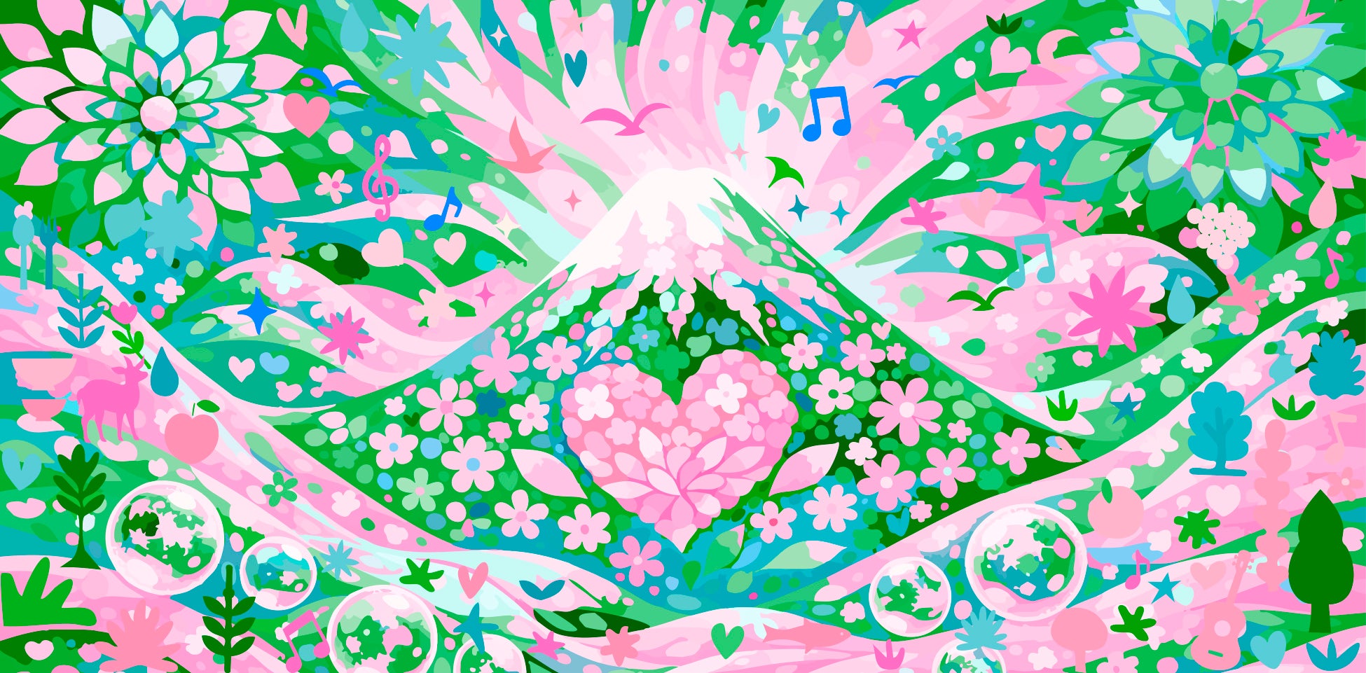 河口湖ステラシアターから望む富士山を象徴的な中心に据え、サステナビューティーフェスから生まれる“ときめき”が、音楽とともに世界へ広がっていく様子を描いています。