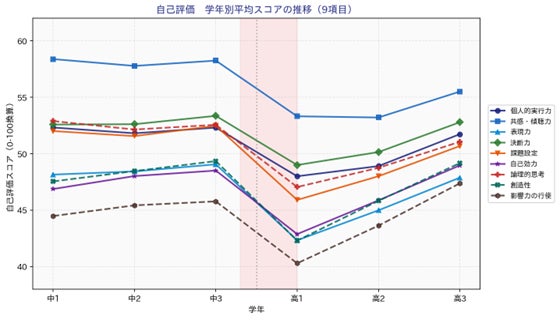 分析対象は、25コンピテンシーのうち自己評価・他者評価の双方で有効回答率が特に高い9項目(課題設定、創造性、論理的思考、個人的実行力、自己効力、決断力、表現力、共感・傾聴力、影響力の行使)に絞っています。信頼性の高いデータが揃う項目に集中することで、学校・学年間の比較や経年トレンドをより精度高く分析しています。