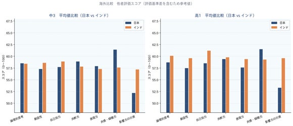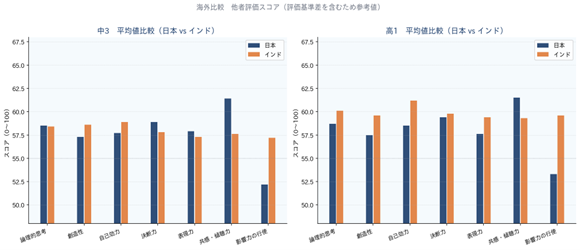 継続受検者が最も成長した項目は「影響力の行使」ですが、国際比較ではインドより5〜7ポイント低く、日本が最も低い水準にある領域です。一方で学校間の差が存在し、環境設計によって変化し得ることがデータで示されています。発言・主導・リーダーシップの機会を意図的に組み込むことで、さらなる成長が期待できます。