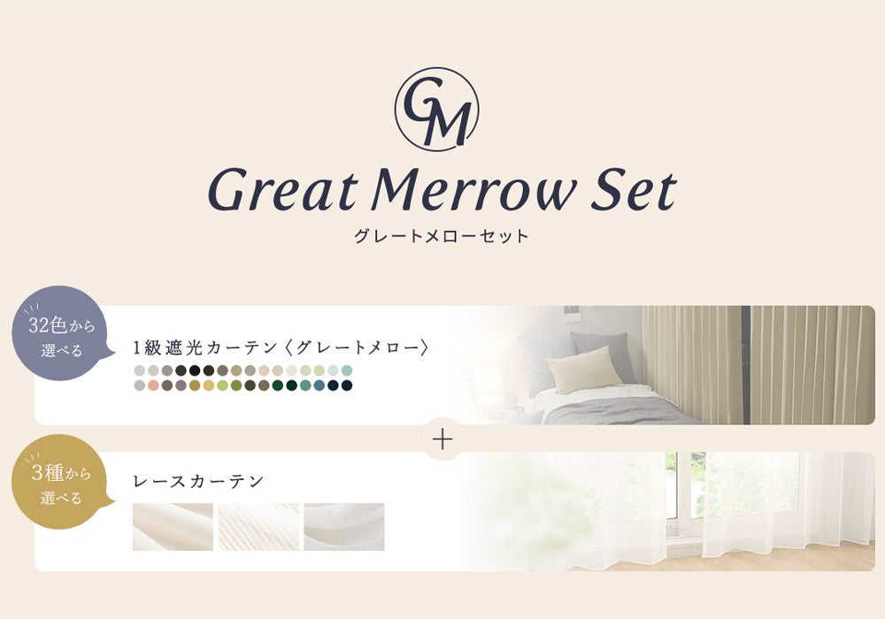 遮光カーテンと合わせてレースカーテンがセットで届く、レースカーテンセットもご用意しております。グレートメローセットは、レースカーテンがセットになっても「最短・翌日出荷」。3種類の選べるレースから、お好みのレ―スカーテンをお選びいただけます。