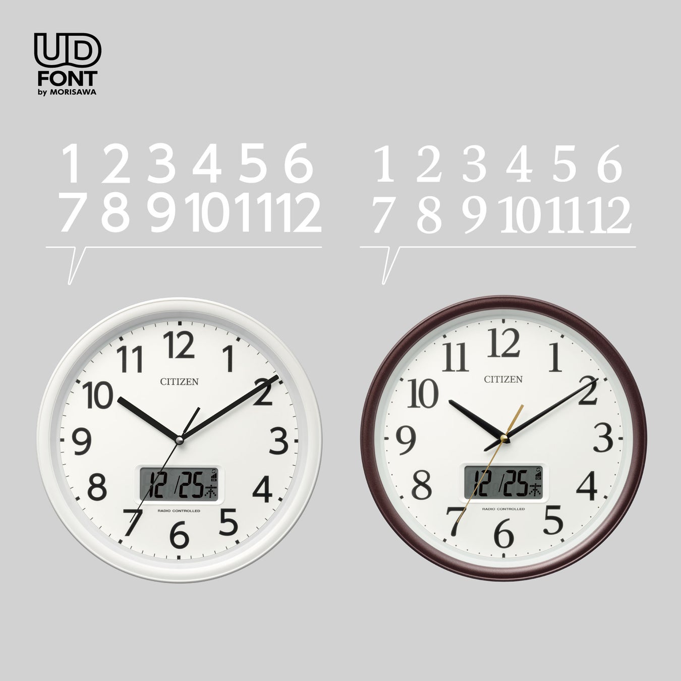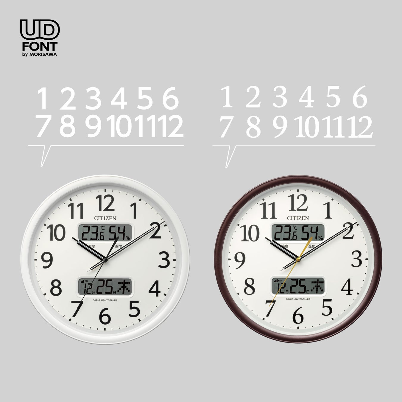 時字には判読性の高いユニバーサルデザインフォントを使用し、読みやすさを追求しました。枠はできる限り存在感を減らし、文字板を広くすることで、更に見やすくなるよう工夫しています。