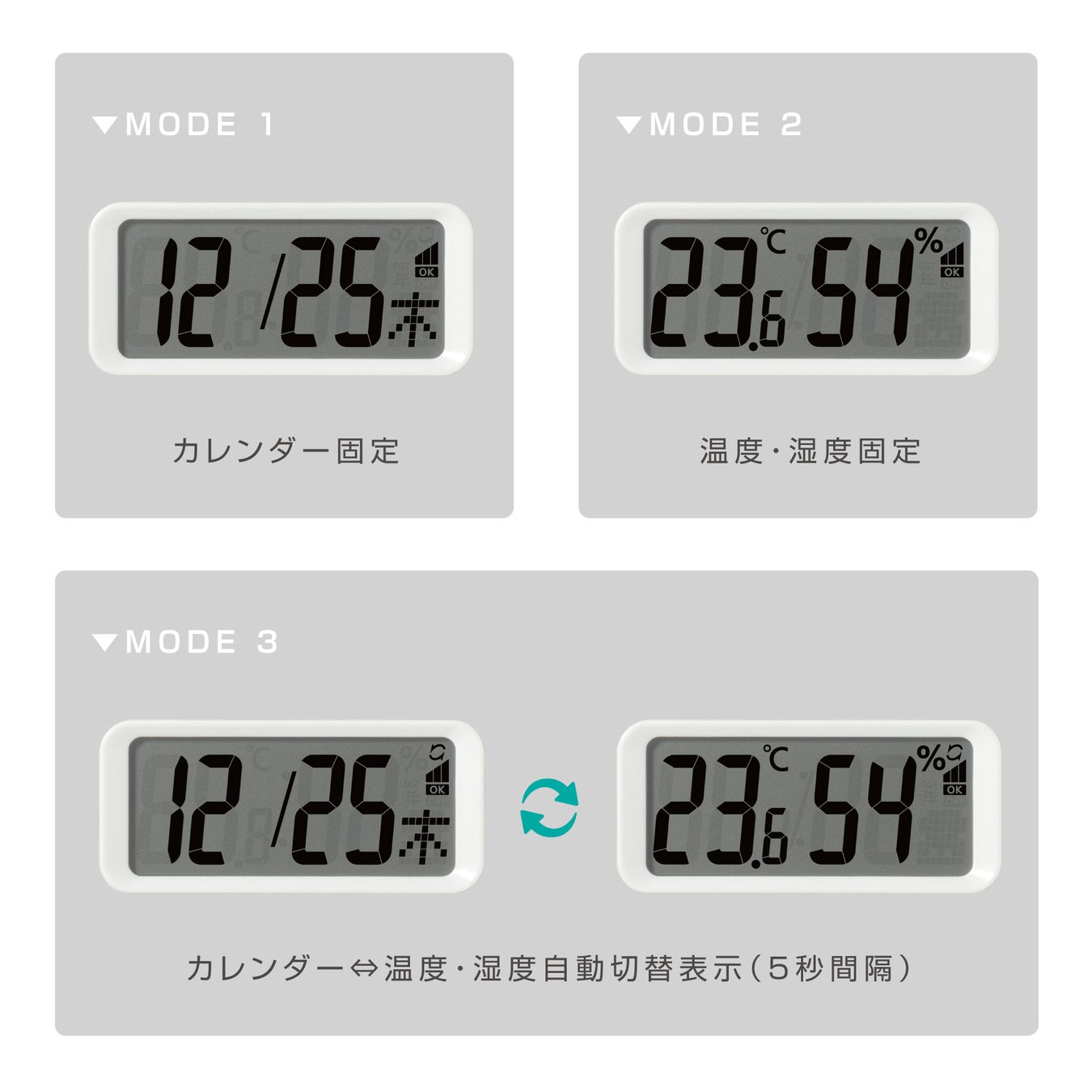 液晶表示は3つのモードから選択できるため、1 つの液晶でもカレンダー/ 温度・湿度を見ることができます。