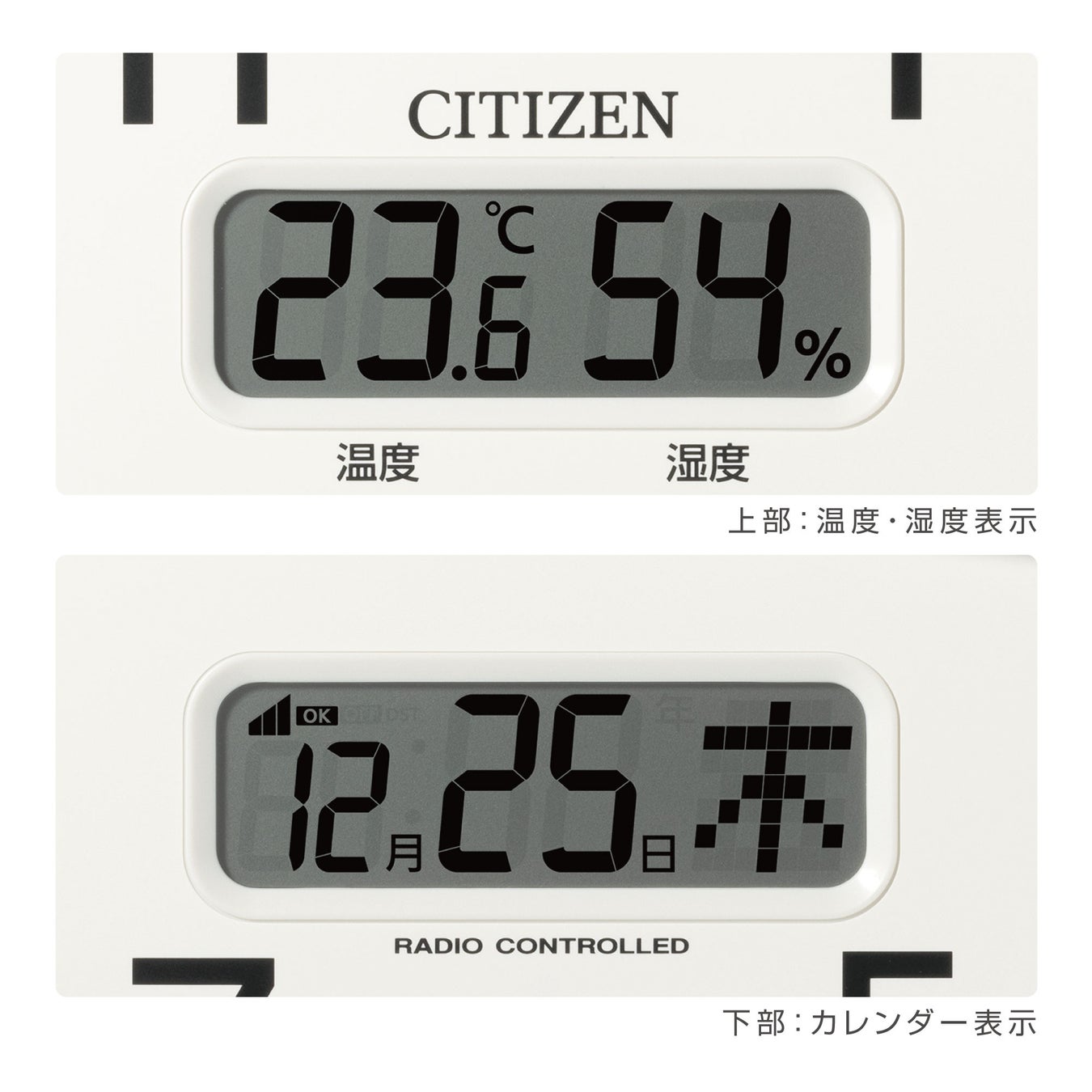 文字板上部の液晶は温度・湿度、下部はカレンダーと、2 枚の液晶が必要な情報をわかりやすくお知らせします。