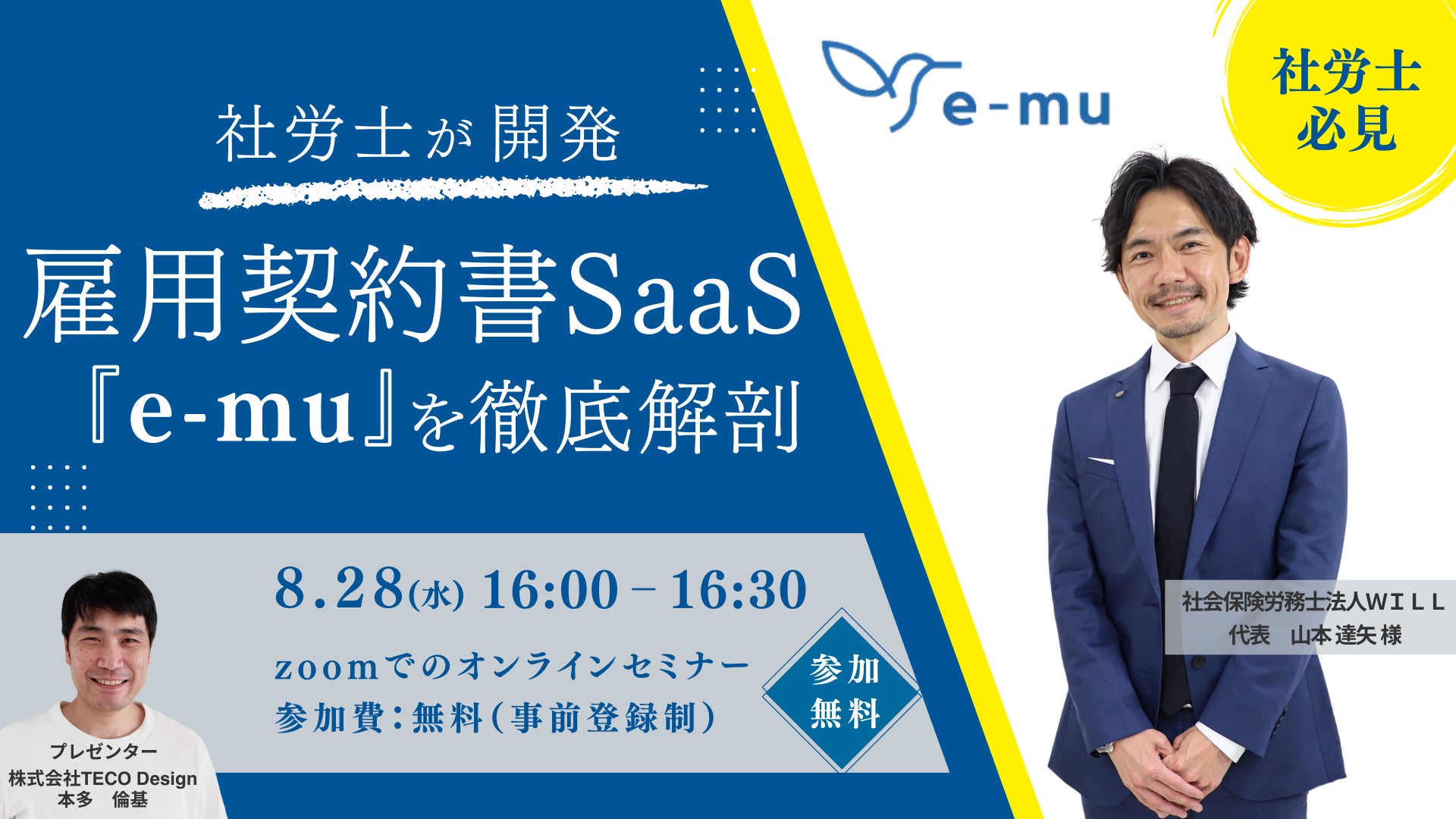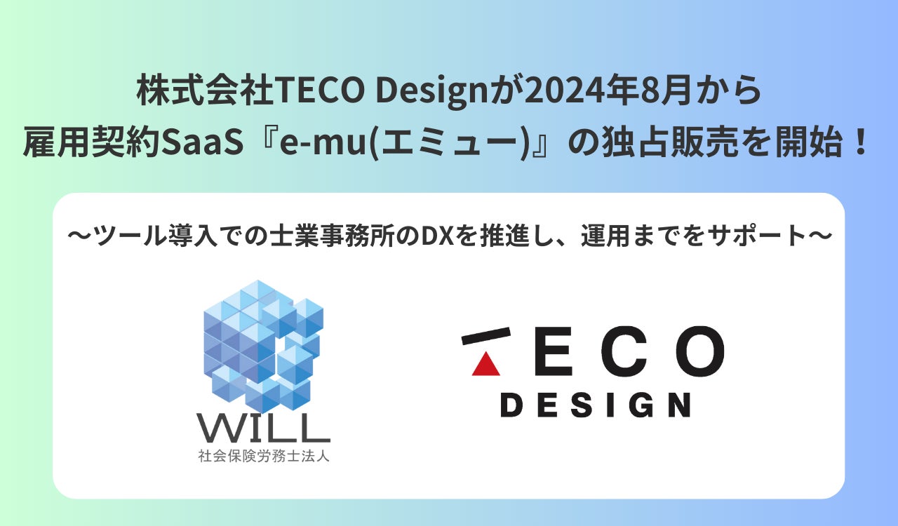 人事労務分野のシステム活用・導入支援を手掛ける株式会社TECO Design(東京都新宿区、代表取締役社長 : 杉野 愼)は、社会保険労務士事務所WILL(大阪府大阪市、代表社員 : 山本 達矢)が開発したミス削減とDXを加速させる雇用契約SaaS『e-mu』の独占販売を2024年8月から開始したことをお知らせいたします。