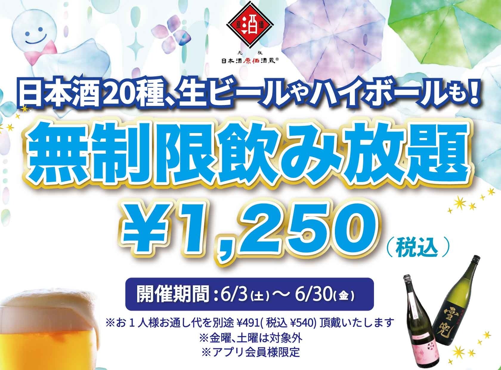 6月3日(土)~6月30日(金)に日本酒原価酒蔵全店にて時間無制限飲み放題¥1,250(税込)を開催します。
