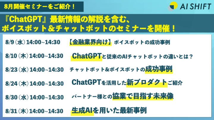 日時 | ①【金融業界向け】ボイスボットの成功事例 8月9日(水) 14:00~14:30 ②ChatGPTと従来のAIチャットボットの違いは? 8月10日(木) 14:00~14:30 ③チャットボット&ボイスボットの成功事例 8月23日(水) 14:00~14:30 ④ ChatGPTを活用した新プロダクトご紹介 8月24日(木) 14:00~14:30 ⑤ 【パートナー企業様向け】協業推進プロジェクトのご紹介 8月30日(水) 14:00~14:30 ⑥ 生成AIを用いた最新事例 8月31日(水) 14:00~14:30 |