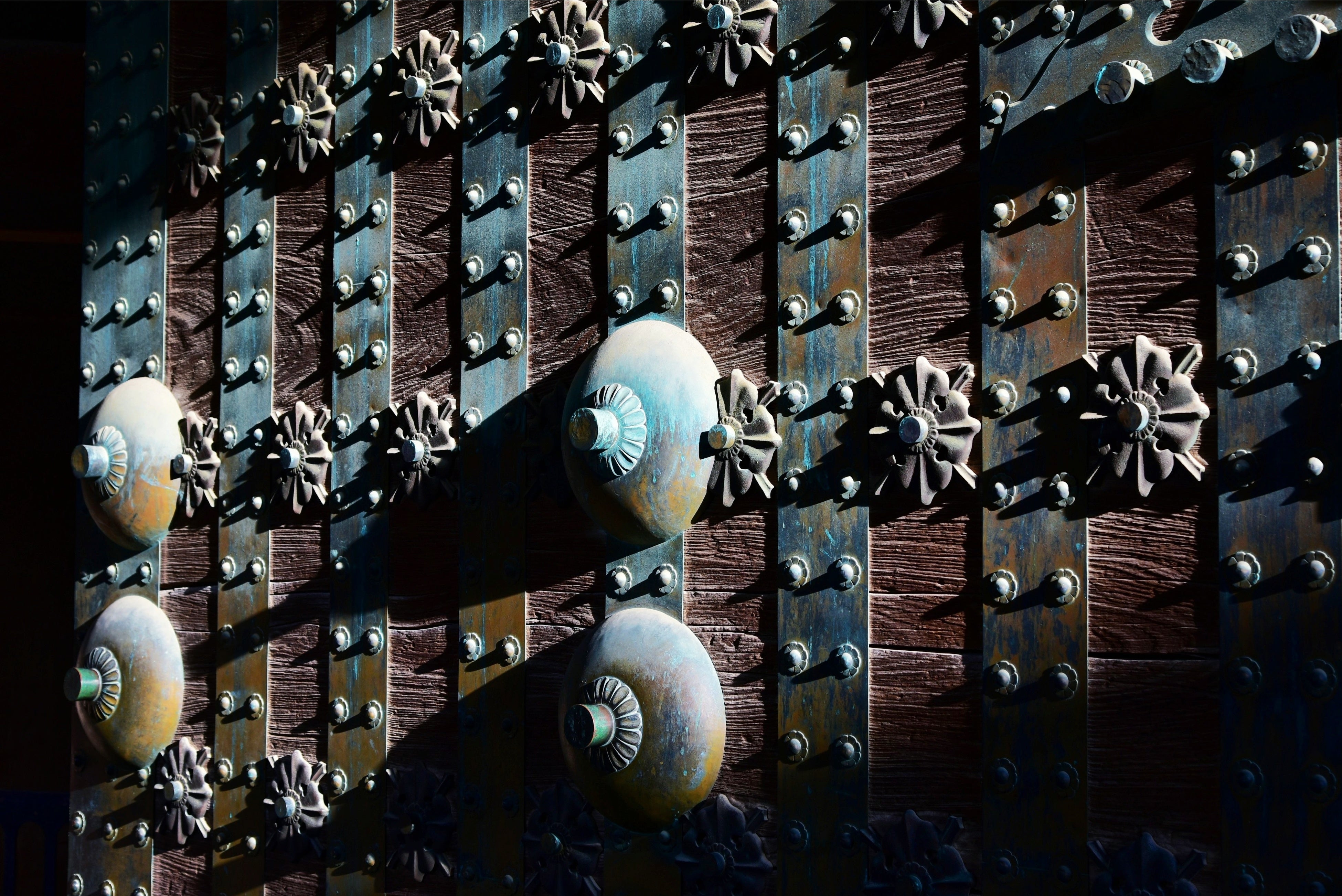 高知城は現存している天守についつい注目してしまいますが、この追手門も実は国の重要文化財に指定されており、見どころの1つです。そんな高知城の追手門に取り付けられている飾り金具「乳金物」は単なる装飾ではなく、扉の中を貫通している金物を隠す役割もあり、実用性もある金具です。