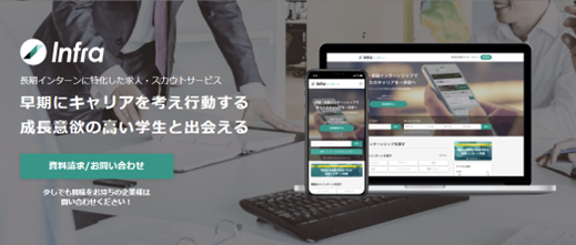 当社では、長期インターン求人プラットフォーム「Infraインターン」(https://www.in-fra.jp/long-internship)を運営し、大学低学年時から企業での長期・有給インターンを望む学生と企業のマッチングを行っております。就職活動における業界選定や職種選定が、単なる憧れではなく、自らの実体験をもって自分に“合う”という確信があること、即戦力として業務を遂行できるスキルを学生時代に身に着けておくことができること、以上の点を踏まえて長期インターンは有効であると考えています。
