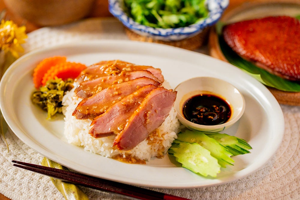 タイではカオマンガイに次ぐポピュラーなメニュー「カオナーペット」。豪快に乗せたタイ産の合鴨で、現地の馴染み深い味にこだわりました。
