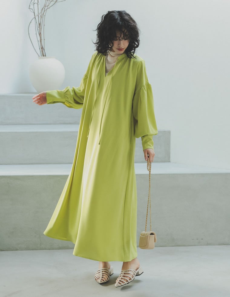 キーネックボリュームフレアワンピース