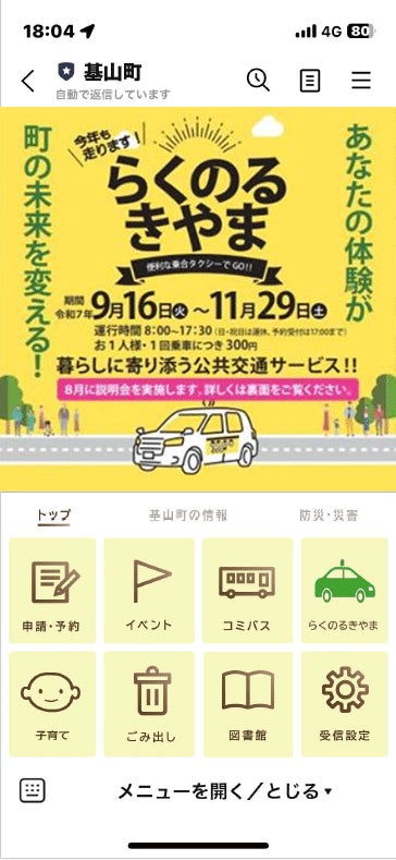 トヨタコニックライドのシステムを提供している予約制乗合型タクシー「らくのるきやま」は、事前予約により複数の人と乗り合わせて、ご自宅等と目的地を運行することで効率的な配車を提供し、公共交通空白地帯域における暮らしに寄り添う公共交通サービスとなることを目指しています。