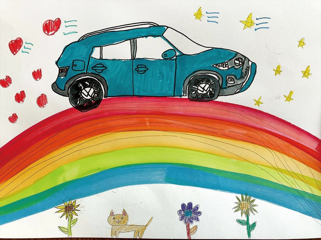 「一緒にお出かけに行くときによく虹を見るから、ママの車で虹の上を 走ってみたい。」と9歳の娘が私の車を描いてくれました。