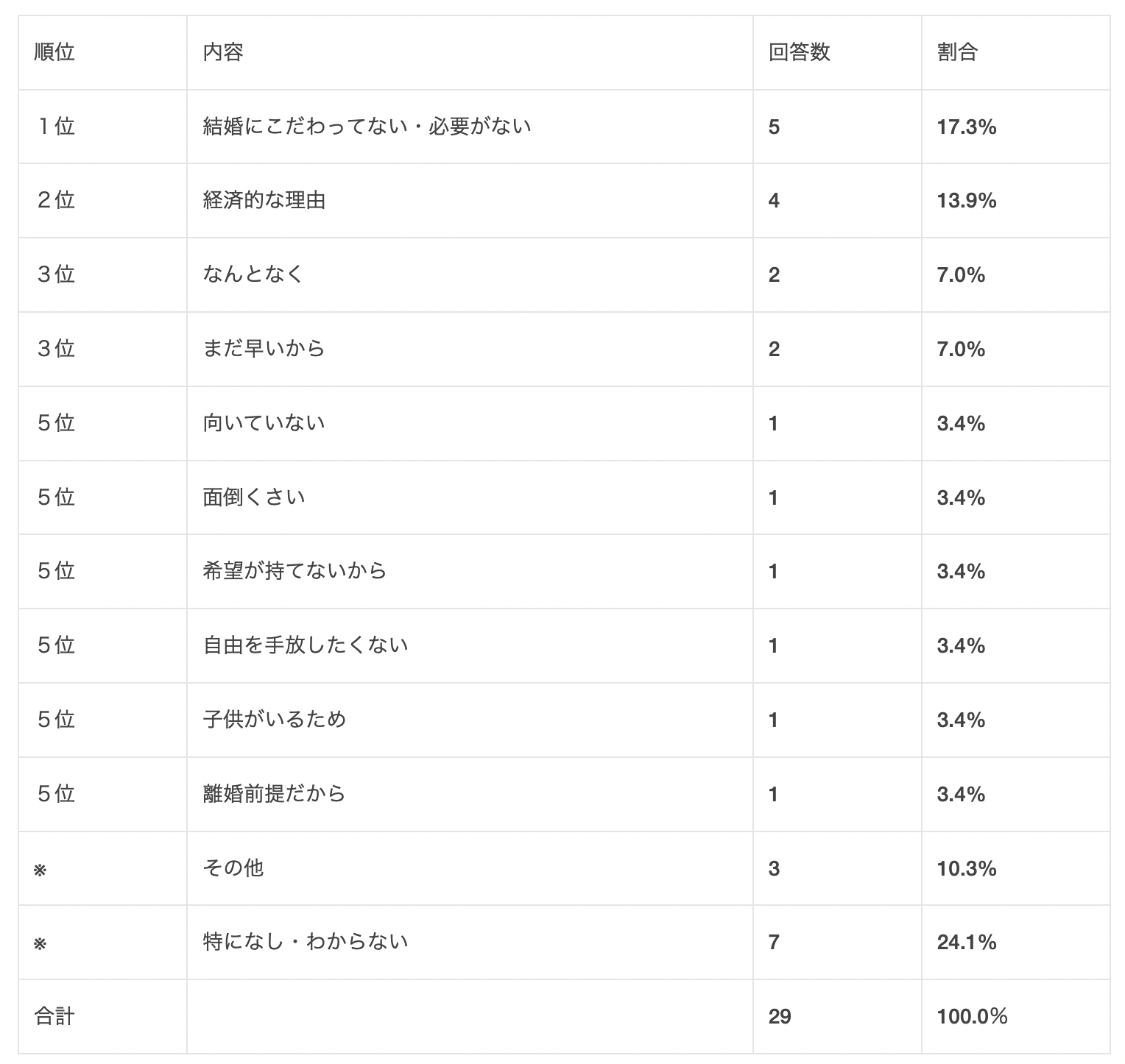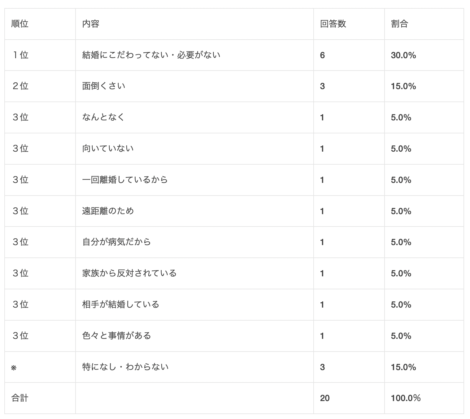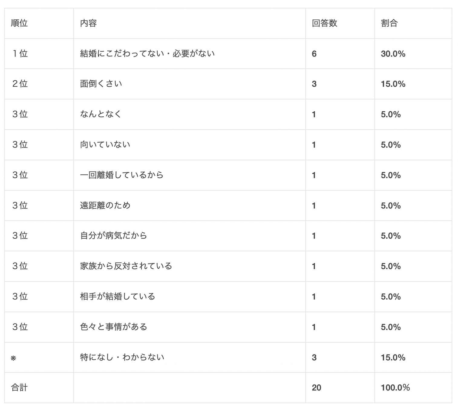 そのほか、男性では「向いていない」「自由を手放したくない」、女性が「一回離婚しているから」「家族が反対している」などの回答がありました。