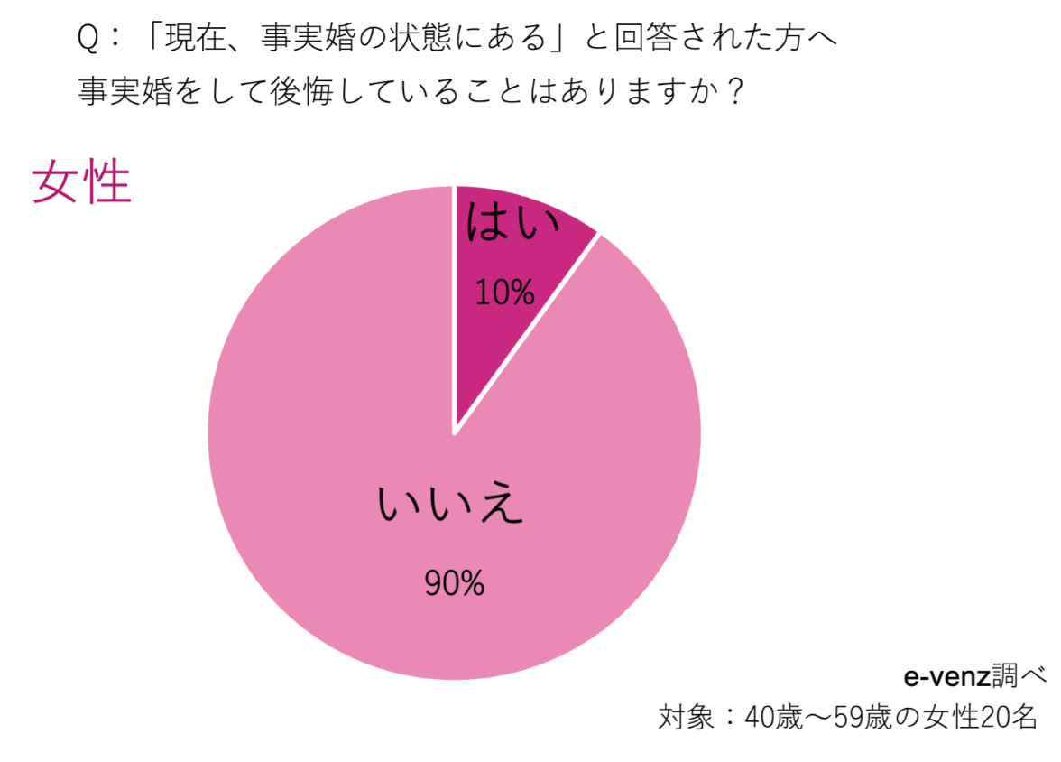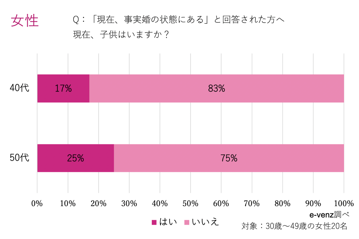 婚活・恋活や街コンなど中心とする男女の出会いメディアe-venz(イベンツ)を運営するノマドマーケティング株式会社(所在地:東京都渋谷区、代表取締役:三輪賢治)では、40代から50代の独身男女1,000名を対象に事実婚についてのアンケートを実施しました。