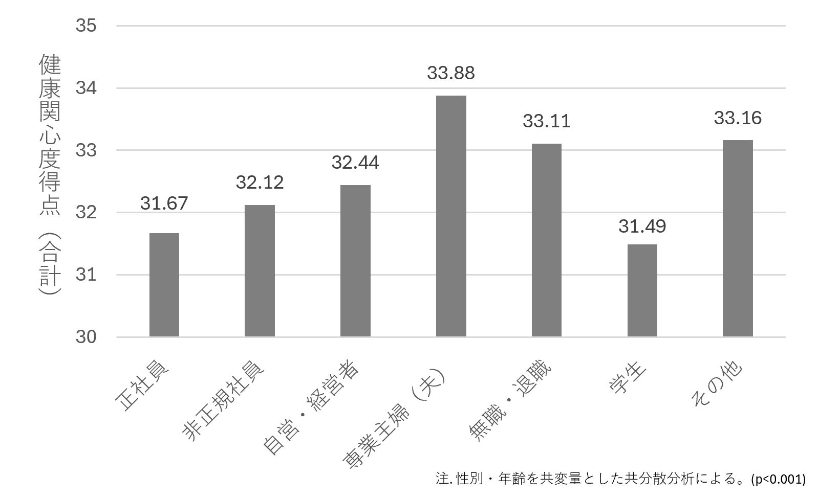 健康関心度尺度の合計得点(12-48点)を用いて、職業との関連を分析した。このうち健康関心度の平均値が最も高かったのは「専業主婦(夫)」33.88、学生を除く勤労者の中では「正社員」が31.67と最も低かった(図2)。
