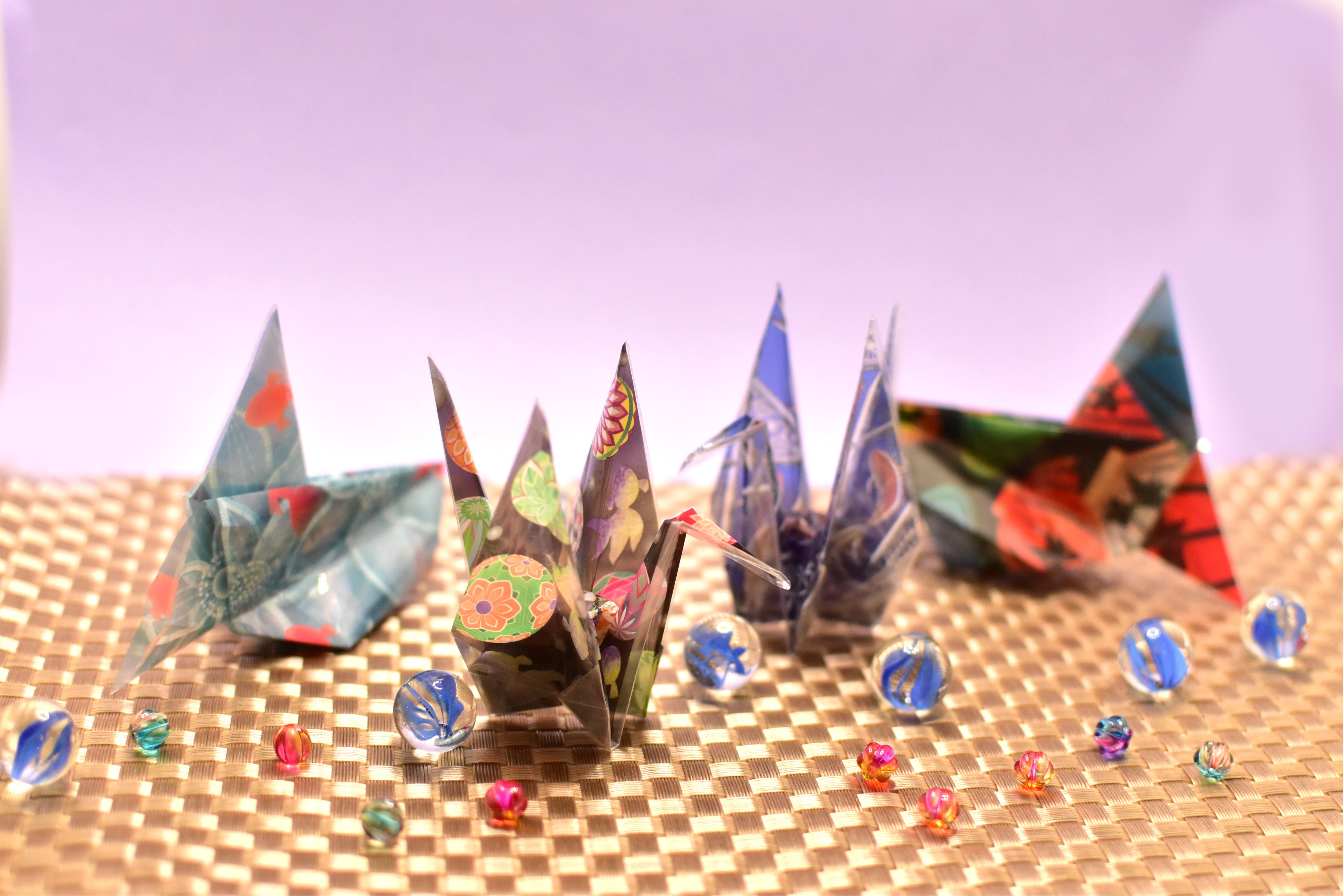 新素材“オリエステルおりがみ®”を使った折り紙は、照明に当てると美しく光ったりと、様々な楽しみ方ができます。